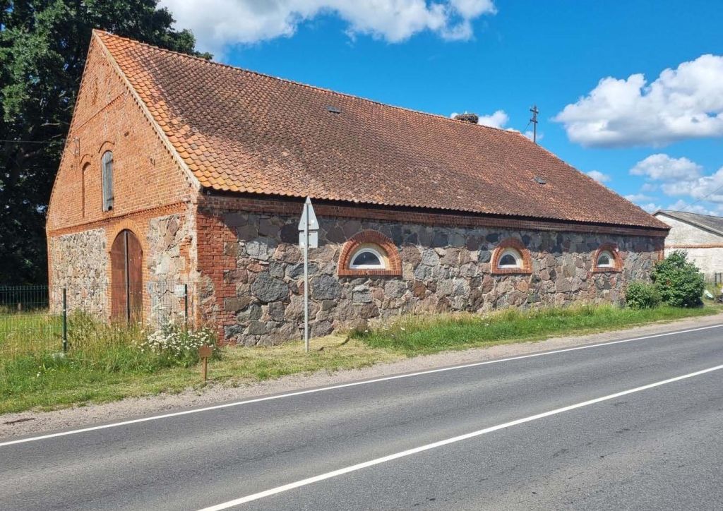 I.Градостроительные характеристики объекта 1.1.Градостроительные характеристики объекта, его роль в композиционно-планировочной структуре поселка Бережковское Черняховского района Калининградской области. Хозяйственная постройка (сарай, амбар) расположена в центральной части поселка Бережковское Черняховского района Калининградской области, на южной стороне автодороги А229 Калининград – Черняховск -Нестеров, являющейся главной улицей поселка (улицей Калининградской).Северным дворовым фасадом здание выходит на искусственный обводной канал, соединенный с рекой Преголя.Здание возведено из красного кирпича и тесаного камня, является образцом типовой хозяйственной постройки конца ХIХ - начала ХХ века, полностью сохранившее свой архитектурный облик. Хозяйственная постройка является частью сохранившейся исторической застройки поселка, представленной одно-двухэтажными жилыми и общественными зданиями и зданиями хозяйственного назначения.II. Объемно-планировочное решение ПамятникаПамятник представлен прямоугольным в плане одноэтажным объемом с мансардой и чердаком. Проездные проемы, выполненные симметрично на боковых западном и восточном фасадах, образуют сквозной проезд (проход).Объем перекрыт высокой двускатной крышей. Здание ориентировано по оси запад - восток. Главным южным фасадом обращено к улице Калининградской.На южном главном фасаде выполнено три оконных проема в уровне первого этажа.Западный боковой фасад завершен треугольным щипцом. На западном боковом фасаде выполнен проездной проем в уровне первого этажа; один дверной (технический) проем и один ложный (заложенный) проем в уровне мансарды; вентиляционный проем в уровне чердака.На северном дворовом фасаде выполнено четыре оконных проема в уровне первого этажа; два (один) дверных проема в уровне первого этажа (возможно, дверной проем слева выполнен после 1945 года).Восточный боковой фасад завершен треугольным щипцом. На восточном боковом фасаде в уровне первого этажа выполнен проездной проем; в уровне цоколя - проем входа в подвал примыкавшего утраченного здания (был внутренним проемом); один оконный проем в уровне мансарды; вентиляционный проем в уровне чердака. 3.1. Конструкция и материал стен и цоколей (форма, материал, характер отделки фасадной поверхности). Капитальные стены южная, западная, северная, в уровне первого этажа выполнены бутовой кладкой с заполнением мелкими камнями на сложном растворе (с внешней и внутренней сторон). Восточная капитальная стена выполнена из красного полнотелого кирпича на сложном растворе под расшивку швов.Углы здания выполнены кирпичной кладкой на сложном растворе под расшивку швов с боковыми прямоугольными зубцами. На боковых западном и восточном фасадах щипцы выполнены из красного полнотелого кирпича под расшивку швов кладки. На южном главном фасаде бутовая кладка выполнена из камней более крупной фракции, чем на северном дворовом фасаде и западном боковом фасаде. Внутренние перегородки и стены выполнены из красного полнотелого кирпича на сложном растворе под расшивку швов. Цоколи выполнены бутовой кладкой с заполнением мелкими камнями на сложном растворе. Цоколи не выступают за плоскости стен.3.2. Конструкция крыши здания (тип, отметки по коньку, материал кровельного покрытия, слуховые окна (местоположени