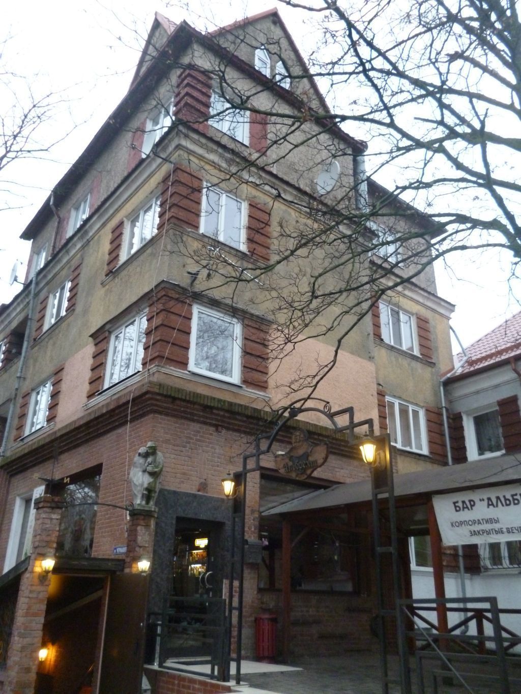 Здание магазина со скульптурной композицией на фасаде