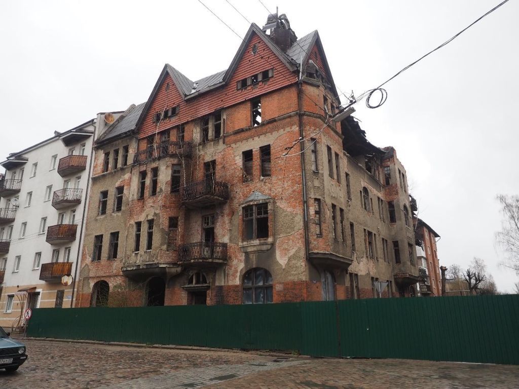 I. Градостроительные характеристики объекта 1.1.Градостроительные характеристики объекта, его роль в композиционно-планировочной структуре улицы Рисунок 1.Местоположение объекта на карте города Черняховска. Рисунок 2. Фото со спутника. Местоположение Памятника в ряду исторической застройки города Черняховска. Фото 1. Памятник в ряду сплошной исторической застройки улицы Комсомольской и улицы Тельмана. Вид с юга.Памятник расположен в районе сохранившейся исторической застройки центральной части города Черняховска, на нечетной стороне улицы Комсомольская. Здание включено в исторически сложившуюся территорию исторической застройки конца ХIХ – начала ХХ века, в целом сохранившей свой архитектурный облик. Жилые комплексы по улице Советской, улице Комсомольской, улице Спортивной являются архитектурными доминантами центральной части города. На улице Гагарина, 1 расположен один из символов города – водонапорная башня.Рассматриваемое здание сохранило стилевые признаки югендстиля и состоит в ряду значимых элементов исторической застройки улицы Комсомольской и улицы Тельмана, формирующей градообразующую историческую среду центральной части города Черняховска.Памятник является частью жилого комплекса, возведенного около 1905 года. Главные уличные фасады зданий, входящих в состав комплекса, в том числе и рассматриваемое здание по адресу улица Комсомольская, 17, оформлены в югендстиле.До настоящего времени жилой комплекс, в том числе и рассматриваемое здание, сохранился практически без изменений архитектурного облика, что определяет его высокий градостроительный статус.II Объемно-планировочное решение2.1.Объемно-планировочное решение ПамятникаФото 1. Общий вид Памятника с юга. Юго-западный и юго-восточный уличные фасады. Фото 2. Общий вид Памятник с севера. Северо-восточный и северо-западный дворовые фасады.Памятник представлен Г-образным в плане четырехэтажным зданием, включает подвал, первый, второй, третий, четвертый этаж, мансарду и неэксплуатируемый чердак. Здание ориентировано по оси юго-восток - северо-запад, имеет пять фасадов: - юго-западный уличный фасад (обращен на улицу Комсомольскую);- юго-восточный уличный фасад (обращен на улицу Тельмана);- северо-восточный дворовый фасад;- северо-западный дворовый фасад;- восточный боковой фасад.Памятник перекрыт высокой двускатной крышей с четырьмя щипцами под собственными двускатными крышами.На южном углу крыши между двумя угловыми щипцами выполнена башенка.Фото 3.. Юго-западный уличный фасад Памятника Юго-западный уличный фасад ПамятникаЮго-западный уличный фасад Памятника имеет несимметричное членение эркером. Эркер полигональный (пятигранный), далее – эркер, выполнен в уровнях второго, третьего этажей. В уровне четвертого этажа эркер завершен открытым балконом.На двух боковых гранях эркера выполнено по одному оконному проему в уровнях второго, третьего этажей. На фронтальной грани эркера выполнено два оконных проема второго этажа; два оконных проема третьего этажа.Справа от эркера на юго-западном уличном фасаде выполнена одна ось открытых балконов в уровнях второго и третьего этажей.На юго-западном уличном фасаде памятника выполнено:- в уровне подвала: шесть оконных проемов;- в уровне первого этажа: три оконных проема и дверной проем главного входа;- в уровне вт