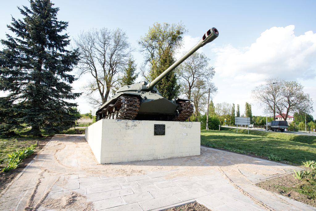 1.Танк ИС-3.2.Наклонный пандус, на котором установлен танк (габариты, угол наклона, материалы).3.Территория объекта, ограниченная полотном автомобильных дорог. 4.Замощение площадок и дорожек.5.Древесные насаждения.