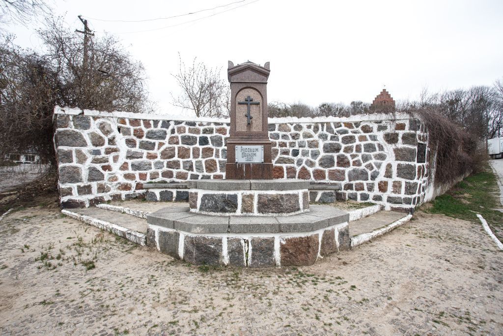 Памятник жителям города Домнау - жертвам Первой мировой войны 1914-1918 гг. с установленным на нем памятным знаком русским воинам 1807 года