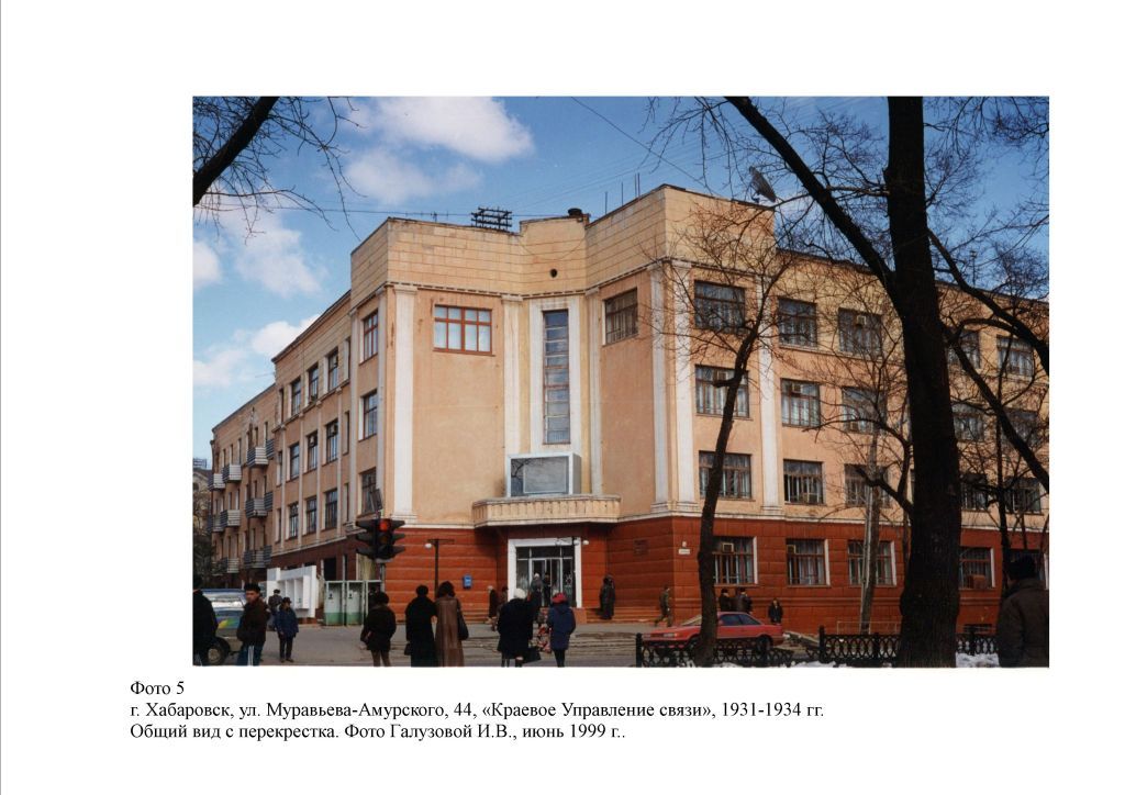 Градостроительные характеристикиМестоположение здания –в северо-западной части квартала, ограниченного улицами Муравьева-Амурского, Волочаевской, Шеронова и Уссурийским бульваром, на земельном участке с уклоном в сторону Уссурийского бульвара, по красной линии застройки улиц Муравьева-Амурского и Волочаевской.Историко-художественная ценность. СтилистикаИнтересный пример сочетания как в конструктивной, так и в архитектурной системах принципов конструктивизма с элементами, присущими периоду советской архитектуры середины 30-х годов ХХ века.Секторы визуального раскрытия,наилучшие точки восприятия зданияНаилучшее восприятие объекта со стороны главных северо-западного фасада по ул. Муравьева-Амурского, главного юго-западного фасада – по ул. Волочаевской.Объемно-пространственная композиция здания на дату завершения строительства – 1936 годЗдание 4-этажное с используемым цокольным этажом, в плане близкое к Г-образному, с дополнительным угловым уличным западным фасадом, с двумя неглубокими ризалитами в одну ось на главных уличных фасадах. Высотные отметки по венчающему карнизу, по аттиковым стеночкам центрального западного фасада.Крыша на дату завершения постройки– 1936 годМногоскатная чердачная крыша, с металлическим покрытием, высотные отметки – по конькам крыши.Конструкции и материалыКонструктивная схема – каркасная, представляет собой монолитный железобетонный каркас с кирпичным заполнением стен. Наружные стены – кирпичные.Композиция и архитектурно-художественное оформление фасадов здания на дату завершения строительства – 1936 годГлавный северо-западный фасад, (по ул. Муравьева-Амурского) состоит из двух объемов – объема постройки 1934 года в 6 осей и более узкого по ширине объема жилого корпуса постройки 1936года в 10 осей, со сквозным проездом на дворовую территорию.Небольшая разница габаритов придает фасаду ступенчатый вид. Крайняя угловая ось административной части здания акцентирована ризалитом небольшого выноса, завершенного глухой аттиковой стеночкой. Стены декорированы рустом, пилястрами высотой в два и три этажа, междуэтажными карнизами, венчающим карнизом.Главный юго-западный фасад (по ул. Волочаевской) также состоит из двух объемов – постройки 1934 года в 4 оси и постройки 1936 года в 5 осей. Крайняя угловая ось акцентирована ризалитом небольшого выноса, завершенного глухой аттиковой стеночкой. Стены декорированы рустом, пилястрами высотой в три этажа, междуэтажными карнизами, венчающим карнизом.Центральный западный фасад образован торцевыми фасадами корпусов, соединенными под углом чуть менее 90 через блок лестничной клетки, расположенной к корпусам под углом. Стены декорированы рустом, пилястрами высотой в три этажа, междуэтажными карнизами, венчающим карнизом.Дворовый северо-восточный фасад в 9 осей имеет свободную асимметричную композицию, состоящую из фасада административной части постройки 1934 года с узкой, углубленной частью в 1 ось около расположенной под углом плоскости парадной лестничной клетки здания с полукруглым входом по оси, фасада жилого дома постройки 1941 года. Фасад без архитектурной отделки, оштукатурен и окрашен.Дворовый юго-восточный фасад в 15 осей, как и северо-восточный, имеет асимметричную композицию и образован основной протяженной частью, узкой в одно окно углубл