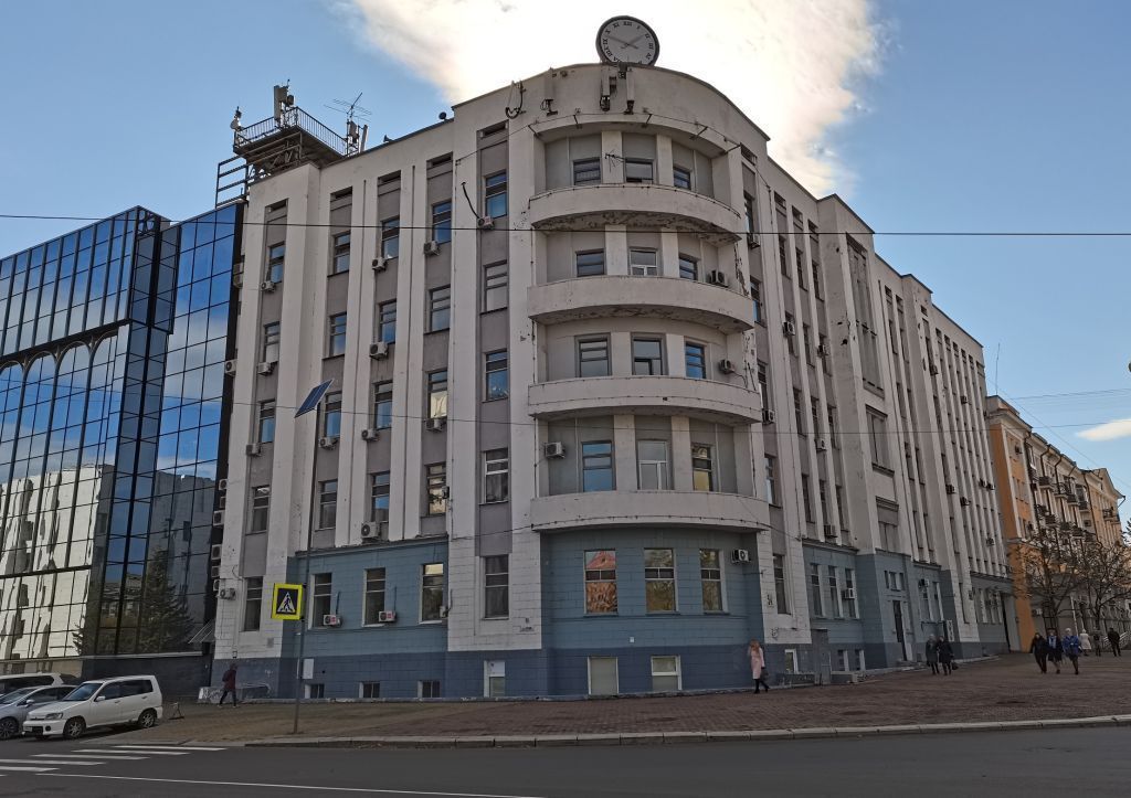 Объемно-пространственная композиция объекта культурного наследия \"Контора \"Дальспирта\", 1927, 1975 гг., ул. Муравьева-Амурского, д. 54 (в том числе конфигурация и габариты крыши, высотные отметки карниза и конька), формирующего застройку площади в юго-западной стороне.