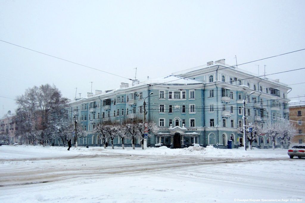 Местоположение здания: в центральной части города, на угловом юго-западном участке квартала, в границах улиц Дзержинского, Пионерской и Орджоникидзе, проспекта Мира. Градостроительная характеристика здания, играющего роль композиционного акцента на пересечении магистралей - улицы Дзержинского и проспекта Мира.Направления наилучших видовых раскрытий здания и его фрагментов в дальнем и ближнем секторах видимости: с перекрестка проспекта Мира и улицы Дзержинского, с проспекта Мира при движении со стороны набережной Амура.Стилистика здания: советская неоклассика с композиционными приемами и характером декоративного оформления фасадов, свойственными периоду конца 1940-х годов.Угловая объемно-пространственная композиция Г-образного в плане здания на невысоком цоколе, образованная прямоугольными в плане крыльями, расположенными по красным линиям улицы Дзержинского и проспекта Мира, соединенными угловым объемом с радиально-вогнутой фасадной поверхностью, примыкающим к торцам крыльев. Разновысотные объемы крыльев здания зрительно объединяются междуэтажным карнизом, отделяющим первой этаж, и венчающим карнизом четырехэтажного крыла по проспекту Мира, переходящим в междуэтажный, отделяющий верхний этаж на фасадах пятиэтажного крыла по улице Дзержинского. Конфигурация и размеры плана, этажность, высотные отметки крыла по проспекту Мира: четырехэтажного, трехподъездного, прямоугольного в плане, вытянутого в северо-западном направлении, завершенного вальмовой чердачной крышей.Конфигурация и размеры плана, этажность, высотные отметки крыла по улице Дзержинского: пятиэтажного, двухподъездного, прямоугольного в плане, вытянутого в юго-восточном направлении, завершённого вальмовой чердачной крышей.Конфигурация и размеры плана, этажность, высотные отметки углового юго-западного объема, соединяющего крылья здания, ориентированного к перекрестку улицы Дзержинского и проспекта Мира: четырехэтажного, в форме трехгранной призмы с вогнутой фасадной поверхностью, завершенного вальмовой крышей.Характер обработки фасадной поверхности: на верхних этажах гладко оштукатуренная и окрашенная, с выделением декоративных элементов контрастным цветом; на первом этаже с рустовкой.Материал и конструкция гладкой фальцевой металлической кровли.Надкровельные элементы: вентиляционные трубы и шахты, увенчанные карнизными поясами простого силуэта.Симметричная композиция юго-восточного фасада пятиэтажного крыла по улице Дзержинского, сформированная вертикальными членениями трехгранных эркеров, отделяющих высокий первый и верхний этажи и зрительно членящих фасад на три части; из которых средняя часть широкая, четырехосная, фланговые - узкие, двухосные; горизонтальными членениями карнизов - венчающего и междуэтажных; осевым местоположением, габаритами и формой оконных и дверных проемов. На первом этаже проемы витражные, арочные, на трех средних этажах - широкие, прямоугольные, в том числе, на третьем и четвертом - осевая пара проемов и фланговые проемы балконные. На пятом этаже оконные проемы с арочными завершениями такой же ширины, как и на средних этажах. По оси эркеров расположенные в нишах прямоугольные дверные проемы входов в помещения первого этажа. Композиция фланговой части юго-западного торца крыла по ул. Дзержинского