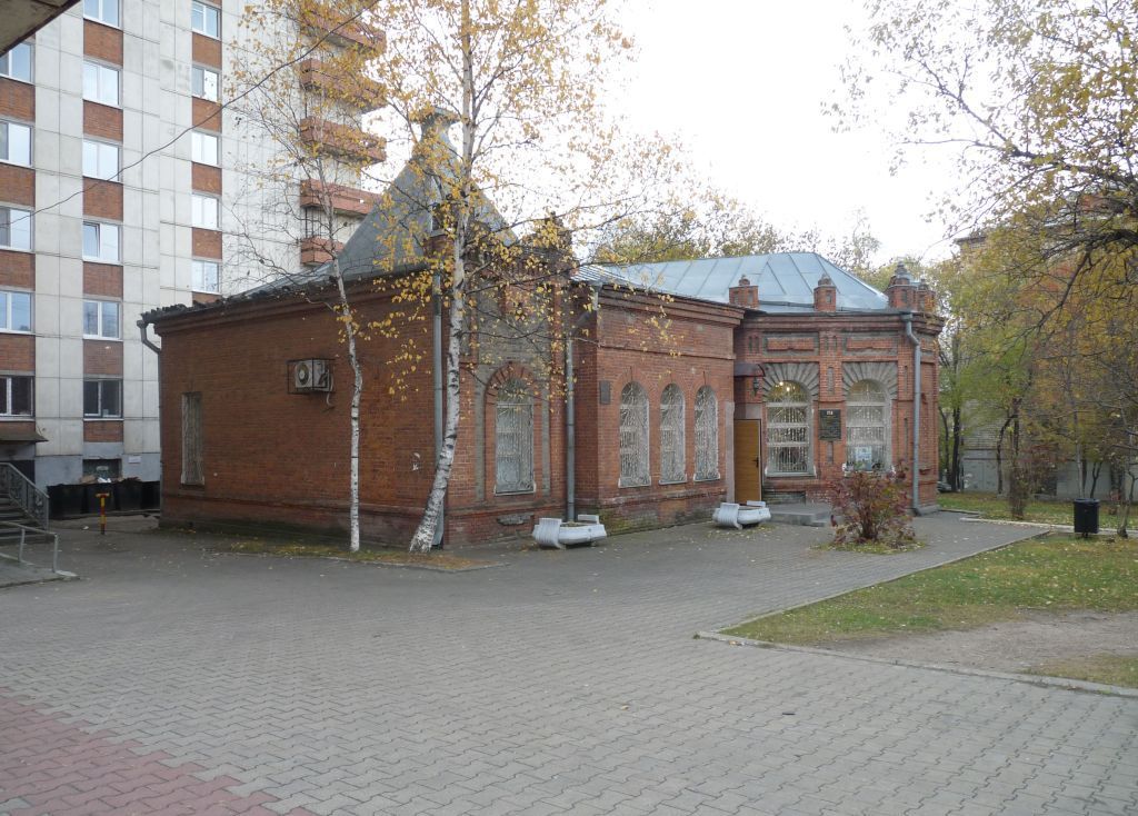 Градостроительная характеристика отдельно стоящего здания, распо-ложенного с отступом от красной линии улицы Пушкина, в средней части склона от улицы Муравьева-Амурского к Амурскому бульвару, на участке, имеющем небольшой уклон в северо-западном направлении. Здание глав-ным северо-восточным фасадом ориентировано на улицу Пушкина.Объемно-пространственная композиция одноэтажного здания с полу-подвалом с западной стороны на понижении рельефа, компактного в плане, с выступающими прямоугольными объемами со стороны главного северо-восточного и дворового юго-западного фасадов и далеко вынесенным пяти-гранным объемом в форме апсиды на месте срезанного северного угла. За-падная, северная и восточная грани абсиды широкие, из них северная и за-падная - в одну световую ось, восточная - в две световых оси; северо-западная и северо-восточная грани узкие, глухие. Над восточным углом здания небольшой четырехгранный шатер. Стилистика здания, построенного в духе эклектики с объемно-прост-ранственной композицией, свойственной модерну, и с элементами декора в духе классицизма в лицевой кладке главного фасада в сочетании красного и серого кирпича.Конфигурация, габариты, высотные отметки чердачной многоскатной крыши с четырехгранным шатром над восточным углом; фальцевая гладкая металлическая кровля.Северо-восточный фасад.Асимметричная композиция главного северо-восточного фасада, составленная двумя основными частями: левой частью, состоящей из трех симметричных участков основного объема, и правой частью - из двух сим-метричных участков (развернутых граней апсиды). Левая часть фасада со-ставлена: средним выступающим широким участком в виде ризалита в три световых оси; левым фланговым западающим участком в одну световую ось; правым узким участком с дверным проемом главного входа. Правая часть фасада составлена гранями апсиды - восточной в две световых оси, глухой северо-восточной, северной в одну световую ось. Местоположение, габариты, конфигурация, оформление проемов:- вертикально-вытянутые с полукруглыми арочными завершениями оконные проемы из которых: три одной ширины сгруппированы по оси средней выступающей части фасада, более широкий проем в западающей левой фланговой части, два проема еще более широкие справа в восточной грани апсиды, один аналогичный проем в северной грани апсиды;- прямоугольный вертикально вытянутый дверной проем в запада-ющем участке справа от ризалита, небольшой овальный горизонтально-вы-тянутый оконный проем, расположенный над дверным проемом. Декоративное оформление северо-восточного фасада: - подоконный пояс, раскрепованный по выступающим и западающим частям всех фасадов здания, составленный полкой со скошенным верхом, поддержанной рядом кирпича с профилем валика;- на всех фасадах здания выступающий цоколь из гранитных блоков, обработанных под рваный камень с гладкой окантовкой, оформленный кор-доном в виде ряда отесанного кирпича в форме полувалика. В левой части северо-восточного фасада цоколь скрыт под поздней отмосткой. Лежачие оконные проемы в приямках полуподвального этажа в цокольной части здания на понижении рельефа: на северо-западном фасаде один проем, сдви-нутый к правому краю среднего участка фасада; на юго-западном фасаде три спаренных проема, расположенных на среднем выступаю