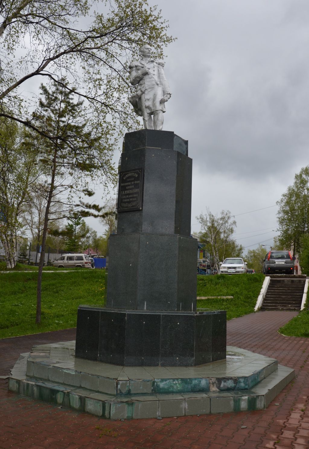 Градостроительные характеристикиМестоположение –в центре города на террасе при спуске ул. Кантера к ул. Невельского и к речному порту. Памятник ориентирован на юг, к р. Амур.Секторы визуального раскрытия, наилучшие точки восприятия памятника – с юго-западной и юго-восточной стороны по ул. НевельскогоСтилистическая и архитектурно-художественная характеристикаПамятник выполнен в классическом стиле, ХХ века.Объемно-пространственная композиция объекта культурного наследияСооружение общей высотой памятника около 7,8 м, скульптуры – 2,8 м, бетонная статуя Г.И. Невельского расположена на высоком восьмигранном ступенчатом пьедестале.Адмиралтейский якорь установлен с южной стороны на площадке на склоне, площадка ограничена двумя бетонными лестничными маршами.Конструкции и материалыСкульптура– из бетона.Постамент – восьмигранный четырехступенчатый параллелепипед.Облицован полированными гранитными плитами темно-серого цвета.Нижнее основание постамента– двухступенчатое восьмигранное.Облицован полированными гранитными плитами серого цвета.Памятная доска на южной грани – лабрадорит черного цвета, по полированной лицевой поверхности гравировкой выбит информационный текст.Адмиралтейский якорь– из железа, окрашен в черный цвет.Бетонная скульптура Невельского Г.И.выполнена в рост. Невельской изображен стоящим с рукой, заложенной за борт офицерского сюртука и смотрящим в сторону Амурского лимана. Фигура несколько развернута в юго-восточном направлении, полы парадного кителя откинуты ветром. В левой опущенной руке – подзорная труба, правая рука прижата к груди, взгляд сосредоточен и серьезен.Скульптура окрашена под бронзу.Постамент – восьмигранный четырехступенчатый параллелепипед,третья ступень несколько вытянута.Материал – полированные гранитные плиты темно-серого цвета.Нижнее основание постамента служит подиумом, двухступенчатое восьмигранное основание с небольшой высотой ступеней. Материал – полированные гранитные плиты серого цвета.Памятная доска расположена на южной грани третьей ступени постамента, выполнена из лабрадорита черного цвета, с выбитым способом гравировки текстом \"Основателю города Николаевска-на-Амуре адмиралу Г.И. Невельскому в день 100-летия города 13 августа 1950года\".Размеры доски– 50 x 75 см.Адмиралтейский якорь с неподвижными рогами (лапами), имеет длину веретена (осевой части) – 4,8 м, расстояние между рогами по прямой – 3,9 м, по их внешней стороне – 4,5 м, каждый рог имеет длину около 2,25 м, вес якоря – 5тонн 100 кг. Материал – железо. Якорь окрашен черной краской.Лестничные марши – на склоне и с северной стороны одномаршевые бетонные спуски.Лестничные марши с наружной стороны и дорожка от склона имеют цепное ограждение на тонких металлических столбиках.Площадка и дорожки огорожены бордюрным камнем.Изменение предмета охраны может быть осуществлено в порядке и случаях, предусмотренных законодательством об объектах культурного наследия.
