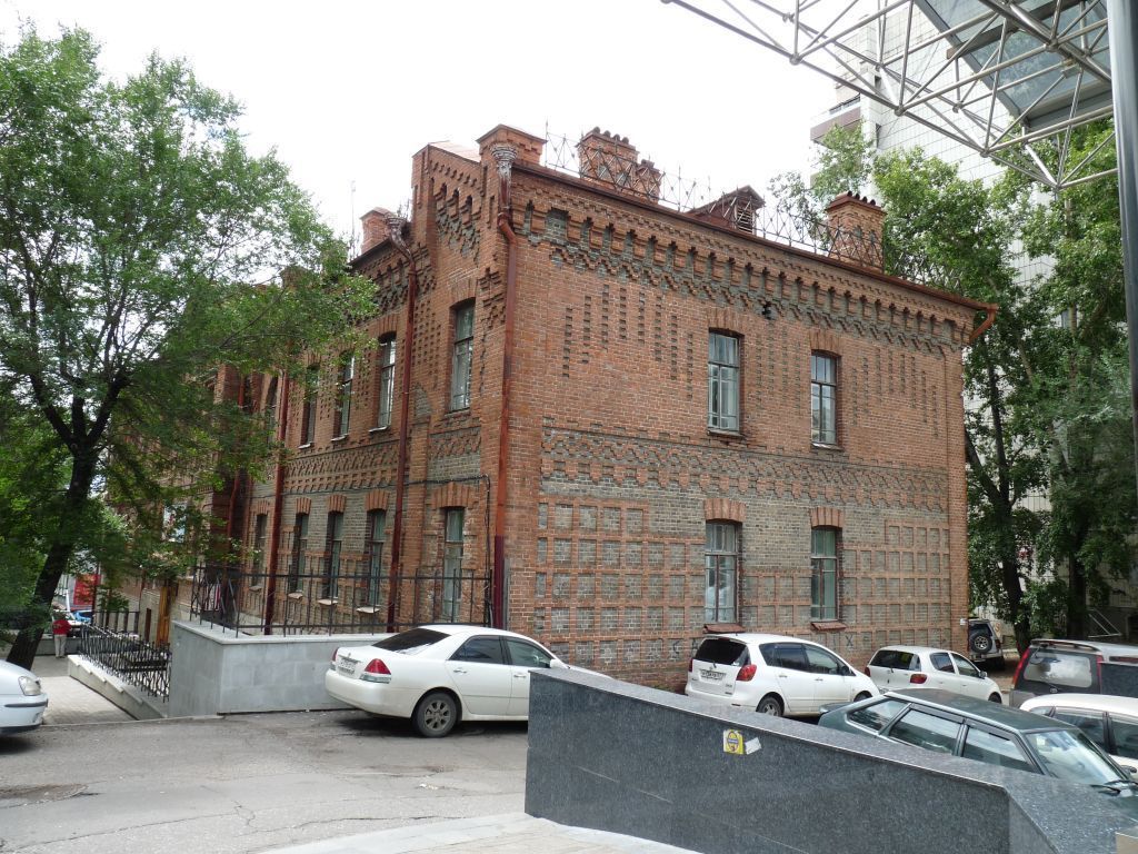 Градостроительная характеристика здания, расположенного в центральной части города, участвующего в формировании участка застройки улицы Гоголя главным северо-восточным фасадом.Объемно-пространственная композиция здания, каменного, двухэтажного с цоколем переменной высоты по рельефу, состоящего из двух крыльев, разного времени постройки и декоративного оформления, северного – прямоугольного в плане и южного – расположенного ниже по рельефу, Г-образного в плане.Конфигурация, габариты и высотные отметки чердачной многоскатной, вальмовой крыши, с фальцевой гладкой металлической кровлей; надкровельные элементы: слуховые окошки прямоугольной формы с деревянными фронтончиками и деревянными жалюзийными решетками (5 шт.); дымовые и вентиляционные трубы прямоугольного в плане сечения с полуцилиндрическими дымоотводами: над северным крылом – с ромбическим рисунком кладки из серого кирпича и рядом зубцов в верхней части, над южным крылом – с профилированным карнизным поясом, воронки водосточных труб, выполненные по историческим образцам.Стилистика здания: северное крыло построено в духе модерна с элементами псевдорусского стиля в декоре кирпичного узорочья, южное крыло – в формах эклектики с элементами классицизма; характер обработки фасадной поверхности: северное крыло – лицевая «цепная» кирпичная кладка, в сочетание красного и серого кирпича в облицовке; южное крыло – лицевая «цепная» кирпичная кладка красного кирпича.Главный северо-восточный фасад:- трехчастная композиция фасада в тринадцать осей оконных проемов, основанная на симметрии, составленная широким ризалитом главного входа, в три оси оконных проемов, и двумя протяженными частями (крыльями) – справа и слева, по пять осей каждая. Ризалит увенчан ступенчатым фронтоном треугольной формы с плечиками, с полуциркульным окошком в тимпане. Углы фасада над крайними осями акцентированы аттиками: над крайней правой – односкатный, ограниченный столбиками, над крайней левой – горизонтальная аттиковая стенка, так же ограниченная с двух сторон столбиками.Декоративное оформление северо-восточного фасада, местоположение, габариты, конфигурация проемов:Северное крыло:- осевое расположение оконных проемов вертикально вытянутых с лучковыми перемычками, на втором этаже, крайний левый проем – асимметричный, в форме половины полуциркульной арки, в цоколе – с клинчатыми перемычками;- рустованные перемычки оконных проемов;- венчающий карниз сложной формы городчатого силуэта;- ковровый рисунок кирпичного узорочья поля фасада: на первом этаже сочетание серого (основное поле) и красного (выступающие элементы), на втором этаже – красного (основное поле) и серого (западающие элементы);- облицовка цоколя бучардированными гранитными плитами, в верхней части декорированная «наплывами» кирпичной кладки;- гладкие лопатки, высотой до окон второго этажа, в уровне венчающего карниза продолжены висячими лопатками, завершенные парапетными столбиками с зубцами в верхней части;- парапетная решетка с рисунком геометрического характера, в виде стоек завершенных пиками, элементов пересеченных крест на крест, в местах соединения зафиксированных хомутами, и элементов в виде завитков завершающий рапорт решетки;- односкатный аттик, ограниченный с двух сторон парапетными столбикам