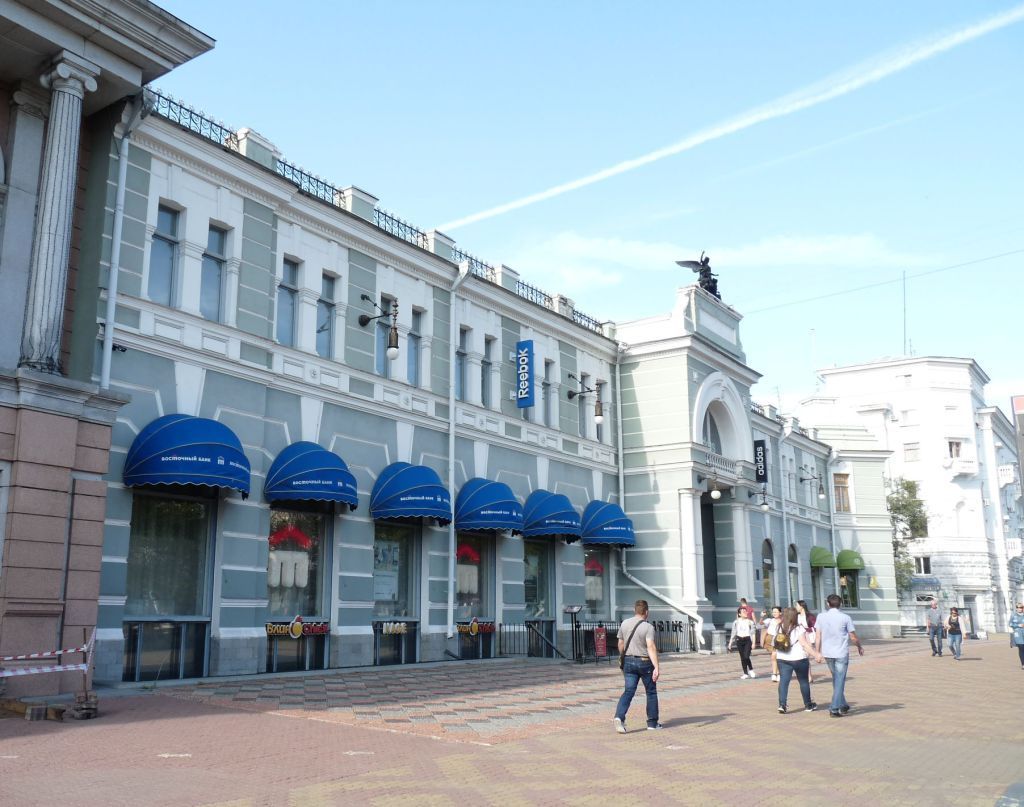 Предметом охраны являются:Градостроительная характеристика здания, участвующего в формировании застройки улиц Муравьева-Амурского и Истомина.Угловая объемно-пространственная композиция двухэтажного Т-образного в плане здания,с высоким подвальным этажом, который со стороны дворового(северо-западного) и северо-восточного фасадов является цокольным этажом.Конфигурация, габариты, высотные отметки конька чердачной вальмовой крыши с кубоватым куполом над угловым ризалитом. Фальцевая гладкая металлическая кровля, материал и декоративное оформление водосточных воронок на главном фасаде.Композиция и архитектурно-художественное оформление фасадов, сложившееся в начале XX века в духе модерна с элементами классицизма в том числе:- композиция протяженного в 13 осей оконных проемов главного (юго-восточного) фасада, акцентированная двумя массивными ризалитами - центральным, завершенным скульптурной группой, и правым угловым, увенчанным кубоватым куполом со шпилем;- асимметричная, разноплановая композиция северо-восточного фасада в шесть осей оконных проемов, с единым декоративным оформлением; композиция узкого, в одну ось, восточного фасада углового ризалита;- разноплановая, четырехчастная композиция дворового, северо-западного фасада, составленная из двух выступающих частей примерно равной ширины, но различного выноса центральной и левой фланговой и двух западающих, протяженных частей в четыре оси оконных проемов каждая.Декоративное оформление лицевых оштукатуренных фасадов:- дощатый руст основного поля фасадов;- междуэтажный и венчающий карнизы, единая подоконная полка второго этажа;- оформление оконных проемов первого этажа высоким веерным замком;- оформление оконных проемов второго этажа в виде рамочных наличников с декоративными вставками в подоконном поле;- горизонтальные парапетные тумбы над простенками;- оформление центрального ризалита, в том числе: арочным порталом, образованным спаренными трехчетвертными колоннами, соединенными архивольтом с горизонтальной балюстрадой в основании арки; гранитным крыльцом входа; декоративным обрамлением дверного проема входа; оформлением аттика; лепным декором в поле фасада;- оформление углового ризалита, в том числе: профилированными порталами дверных проемов (портал проема второго этажа с высоким декоративным замковым камнем); небольшим балконом, огражденным балюстрадой; завершением второго этажа арочным архивольтом, поставленным на раскрепованный венчающий карниз, поддержанный широко расставленными парами трехчетвертных колонок; пятиступенчатым гранитным крыльцом входа.Декоративное оформление дворового фасада:- дощатый руст основного поля фасада (за исключением крайней правой его части);- обработка цокольного этажа штукатуркой с крупным квадровым рустом;- междуэтажный и венчающий карнизы, единая подоконная полка второго этажа;- декоративное оформление оконных проемов второго этажа наличниками и полуналичниками;- декоративная кладка перемычек первоначальных оконных проемов первого этажа.Местоположение, габариты и конфигурация дверных и оконных проемов:- входныепроемы в ризалитах: на центральном ризалите -широкий с лучковым завершением дверной проем и арочный проем лоджии над ним;на угловом ризалите -высокий прямоугольный дверной проем и более узк