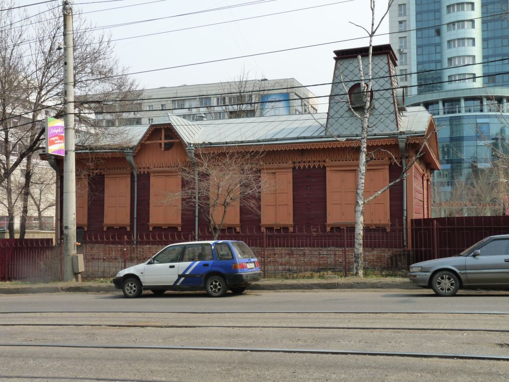 Градостроительная характеристика здания, расположенного в центральной части города, поставленного на склоне рельефа, участвующего в формировании участка застройки ул. Шеронова главным юго-западным фасадом, на отрезке между ул. Муравьева-Амурского и Амурским бульваром.Объемно-пространственная композиция одноэтажного, на высоком цоколе переменной высоты по рельефу, Т-образного в плане деревянного здания, состоящего из основного объема вытянутого вдоль улицы, акцентированного усеченным шатровым куполом квадратного в плане сечения, над южным углом, и небольшого пристроя со стороны дворовой территории.Конфигурация, габариты и высотные отметки чердачной крыши: над основным зданием – полувальмовая, над пристроем – односкатная; кровля фальцевая гладкая металлическая, усеченный шатер – с ромбовидной металлической черепицей. Надкровельные элементы: слуховые окна полукруглой формы; дымовые и вентиляционные трубы с зонтами в верхней части, облицованные металлом, воронки водосточных труб, выполненные по историческим образцам.Стилистика здания, построенного в стиле деревянного зодчества; плоскости стен окрашены в темные тона с выделением резных наличников и подзоров контрастным цветом; каменный цоколь, выполненный в лицевой «цепной» кирпичной кладке.Главный юго-западный фасад:?композиция главного юго-западного фасада в шесть осей оконных проемов, акцентированная в верхней части треугольным фронтоном с полувальмой, по третьей оси слева, и усеченной шатровой башней, квадратной в плане, по крайней правой оси.Декоративное оформление главного юго-западного фасада, местоположение, габариты и конфигурация проемов:?осевое расположение оконных проемов прямоугольного очертания; в тимпане фронтона – оконный проем круглой формы, в усеченном шатре – оконный проем формы подрезанного в основании круга;?один ярус пропильного подзора далекого выноса с пропильными кронштейнами в основании;?фриз с пропильным декором;?рамочные наличники оконных проемов: гладкие стойки, накладные филенки в верхней части, горизонтальный сандрик с прямоугольными пропилами, два ряда зубцов – сверху, над филенкой и снизу, под подоконной полкой, свесы полки с круглыми накладными элементами по краям, филенчатые ставни;?оформление полувальмового фронтона пропильными причелинами и распорной крестовиной;?гладкие прибоины на флангах.Боковой северо-западный фасад:?разноплановая композиция фасада, образованная двумя частями: на переднем плане часть фасада, в две оси оконных проемов, смещенных от оси влево, завершенная фронтоном с полувальмой, на дальнем плане слева часть фасада, в одну ось оконных проемов, смещенных от оси вправо.Декоративное оформление бокового северо-западного фасада, местоположение, габариты и конфигурация проемов:?осевое расположение вертикально вытянутых оконных проемов прямоугольной формы, на дальнем плане небольшой оконный проем прямоугольного очертания;?декоративное оформление идентично оформлению юго-западного фасада, за исключением гладкого фриза и отсутствия ставень на окне в пристрое на дальнем плане.Дворовый северо-восточный фасад:?разноплановая композиция фасада, образованная тремя частями: на переднем плане в центре – симметричная часть фасада в три оси оконных проемов, на дальнем плане справа и слева части фас