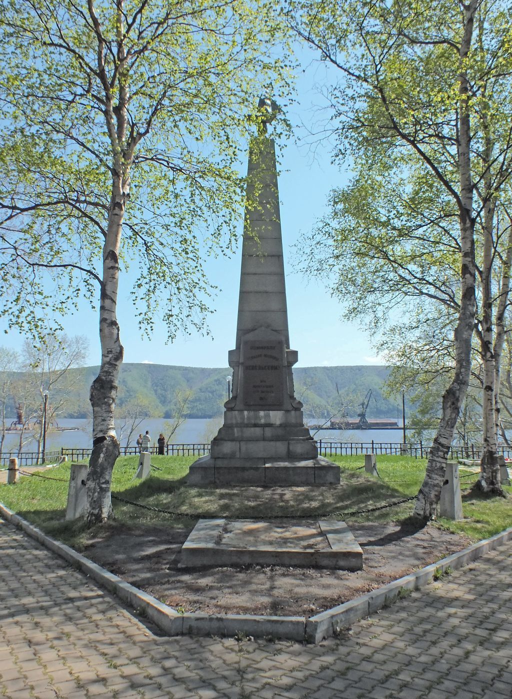 Предметом охраны объекта культурного наследия являются:Градостроительная характеристика монумента, расположенного в западной части Пионерского парка, между высоким берегом р. Амура и ул. Советской, лицевой северной стороной ориентированного на ул. Советскую.Объемно-пространственная композиция, решенная в классическом стиле: на квадратном в плане ступенчатом со сложной профилировкой граней постаменте установлен четырехгранный пирамидальный, усеченный сверху обелиск, увенчанный поздней моделью парусника, укрепленного на чугунном шаре, являющемся элементом первоначальной скульптуры двуглавого орла.Форма и параметры обелиска, сложенного из 12 трапециевидных блоков, верхний из которых имеет пирамидальное завершение.Форма и параметры постамента, состоящего из двух основных частей, нижняя из которых оформлена в виде четырех профилированных ступеней, верхняя имеет переднюю грань в виде фигурной массивной доски с треугольным верхом, расширяющейся к низу. Размеры монумента: общая высота – 6,0 м, высота постамента – 1,7 м, высота обелиска – 4,0 м, сечение обелиска в нижней части – 1,0 х 1,0 м, в верхней – 0,4 х 0,4 м.Материал и характер обработки: гранитные блоки серого цвета.Мемориальные бронзовые доски:- крупная вертикальная, укрепленная на фигурной северной грани постамента с надписью из объемных букв: \"Адмиралу Геннадию Ивановичу Невельскому отъ почитателей его заслугъ. 1913 г.\";- небольшие горизонтальные, укрепленные на западающих гранях верхней части постамента с надписями с восточной стороны: \"Первого августа 1850 года здесь впервые поднятъ русский флагъ волею государя Николая Павловича и край присоединенъ къ державе Российской\"; с западной стороны: \"Там, где поднят русский флагъ, онъ уже опускаться не долженъ\".Гладкоствольное крепостное орудие, установленное на чугунном лафете на площадке перед памятником.Изменение предмета охраны может быть осуществлено в порядке и случаях, предусмотренных законодательством об объектах культурного наследия.