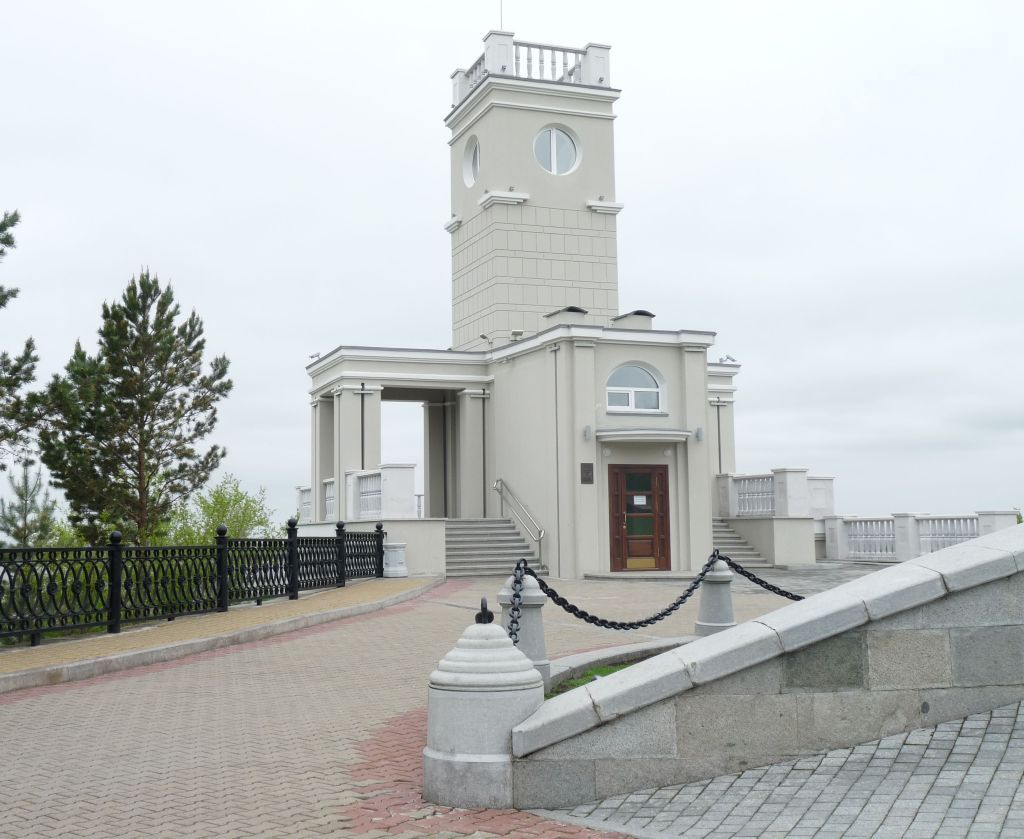 Градостроительная характеристика здания, расположенного в северо-западной части парка им. графа Н.Н. Муравьева-Амурского, на уступе скалистого утеса над Амуром, играющего важную роль в формировании береговой полосы и панорамы центральной части города с реки, организующего в сочетании с памятником Муравьеву-Амурскому и аллеями парка выразительный архитектурно-ландшафтный ансамбль.Объемно-пространственная композиция здания – паркового сооружения, состоящего из двухэтажного полукруглого в плане объема в тринадцать световых осей, с прямоугольными выступами с двух сторон (незначительным выступом с юго-восточной стороны, в виде ризалита, и далеко вынесенным выступом с северо-западной стороны), врезанного в скалу с северо-востока, со стороны реки, с плоской совмещенной крышей – смотровой площадкой, расположенной почти на одной отметке с вершиной утеса, с возвышающейся над площадкой квадратной в плане трехъярусной башней с прямоугольными портиками с юго-восточной и северо-западной сторон и пристроенным поздним объемом тамбура главного входа с северо-востока.Стилистика здания, построенного в духе конструктивизма с сочетанием мотивов довоенной советской неоклассики со стилизацией ордерной архитектуры в декоративном оформлении фасадов.Крыша. Плоская совмещенная крыша основного двухэтажного объема с покрытием гранитной плиткой (смотровая площадка), плоские совмещенные покрытия портиков и башни; надкровельные элементы: в завершении башни – парапет с угловыми столбиками, соединенными балюстрадой. Угловые столбики с плоскими нишами в гранях, завершены карнизом, балюстрада составлена шестью тонкими балясинами.Композиция и декоративное оформление частей здания, местоположение, габариты, конфигурация проемов.Вертикально вытянутые прямоугольные оконные проемы без обрамления, расположенные на двух этажах равномерно в основной части полукруглого в плане объема, имеющего гладкие наружные стены без декоративного оформления, завершенного простым карнизом. Средний проем на втором этаже балконный (небольшой балкон огражден простой металлической решеткой); более широкие оконные проемы (по одному на двух этажах) по оси юго-восточного ризалита основного объема; аналогичные оконные проемы на далеко вынесенном северо-западном выступе: один проем с северо-западной стороны, два проема на юго-восточной стороне.Объемная композиция трехъярусной башни, с возвышающимися над портиками двумя верхними ярусами с симметричными гранями, с круглым окном по оси в верхнем ярусе каждой грани, с балконом с юго-западной стороны (в круглом окне по оси устроен узкий дверной балконный проем, ограждение балкона – простая металлическая решетка) и с прямоугольным дверным проемом (выход на видовую площадку из здания) в нижнем ярусе слегка выступающей юго-западной грани, фланкированной лопатками, по которым раскрепован завершающий нижний ярус стилизованный антаблемент, являющиеся продолжением антаблемента боковых портиков. Декоративное оформление граней башни:– рустовка граней в среднем ярусе; трехступенчатые, в виде крыльев, короткие огибающие полки в углах, разделяющие верхние ярусы башни; фриз, отделенный двухступенчатым узким поясом, и трехступенчатый карниз с широкой верхней полкой и двумя узкими нижними.Объемно-пространственная к
