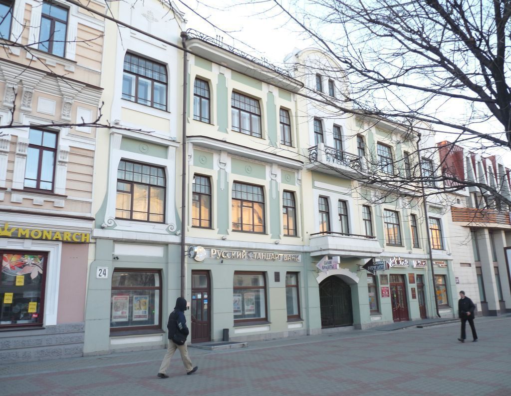 Место расположения: в ряду сплошной застройки красной линии ул. Муравьева-Амурского, на участке, ограниченном улицами Фрунзе и Калинина.Объемно-пространственная композиция на период реконструкции 1930 г., составленная двумя трехэтажными с низким цоколем, прямоугольными в плане объемами: основным, протяженным вдоль улицы Муравьева-Амурского, и примыкающей к нему под прямым углом узкой дворовой пристройкой.Габаритные размеры здания в плане: основной объем 24,5х14 м, дворовая пристройка 16,8х7 м; высотные отметки карниза, аттиков, конька крыши.Конфигурация и размеры двускатной чердачной крыши. Материал и конструкция гладкой фальцевой металлической кровли.Материал и техника исполнения наружных стен лицевая «цепная» кладка красного кирпича на дворовых фасадах, штукатурка по кирпичу (на первом этаже с имитацией дощатого руста), окраска с выделением цветом декоративных элементов – на главном; облицовка цоколя главного фасада тесаными гранитными блоками серого цвета. Главный северо-западный фасадСтилистика: модерн.Композиция: симметричная, акцентированная по оси широкой проездной аркой, образованная пятью основными частями, три из которых (центральная и фланговые) решены в виде ризалитов, завершенных лучковыми аттиками, возвышающимися над вынесенными карнизами промежуточных частей.Наружные оконные и дверные проемы: очертания и размеры (широкие и узкие со скошенными верхними углами, в том числе небольшие проемы центрального аттика; узкие проемы первого этажа с одним скошенным углом); количество и расположение (осевое: в боковых ризалитах – по одному широкому, в центральном – по два узких, на промежуточных плоскостях чередование широких и узких).Материал и расстекловка оконных заполнений в соответствии с первоначальным историческим видом: деревянные, двух- и трехстворчатые (в соответствии с шириной проема), имеющие верхнюю неоткрываемую фрамугу, в том числе на верхних этажах с ячеистым членением тонкими переплетами.Материал и рисунок заполнений дверных проемов в точной копии с историческими. Карнизы и пояса, в том числе: венчающий карниз, размеры, форма и профилировка: в виде сильно вынесенных над промежуточными частями фасада профилированных плит с закругленными краями, поддержанных декорированными кронштейнами и профилированным пояском между ними; карниз между вторым и третьим этажами (венчающий до надстройки в-1930 г. третьего этажа), схожий с венчающим, но с орнаментированным пояском и отличной профилировкой плиты; карниз между первым и вторым этажами, простой, в виде широкой полочки со скошенной верхней гранью, раскрепованный по ризалитам и балконной плите.Элементы центрального ризалита: очертания и оформление аттика, в том числе: карниз, фланговые заглубленные столбики, выступающая плоскость с лучковым завершением и фигурным нижним краем с наложенным на нее наличником – в центре и рельефными элементами в виде кольца, пересеченного тремя горизонтальными и тремя вертикальными линиями на флангах. наличники, объединяющие пары окон: на втором и третьем этажах плоские прямоугольного очертания, в аттике с грибовидным завершением и рельефным грибовидным элементом между окнами; плоские горизонтальные филенки над окнами второго и третьего этажей; габариты, конструкция и оформление протяженных балконов: на втором эта