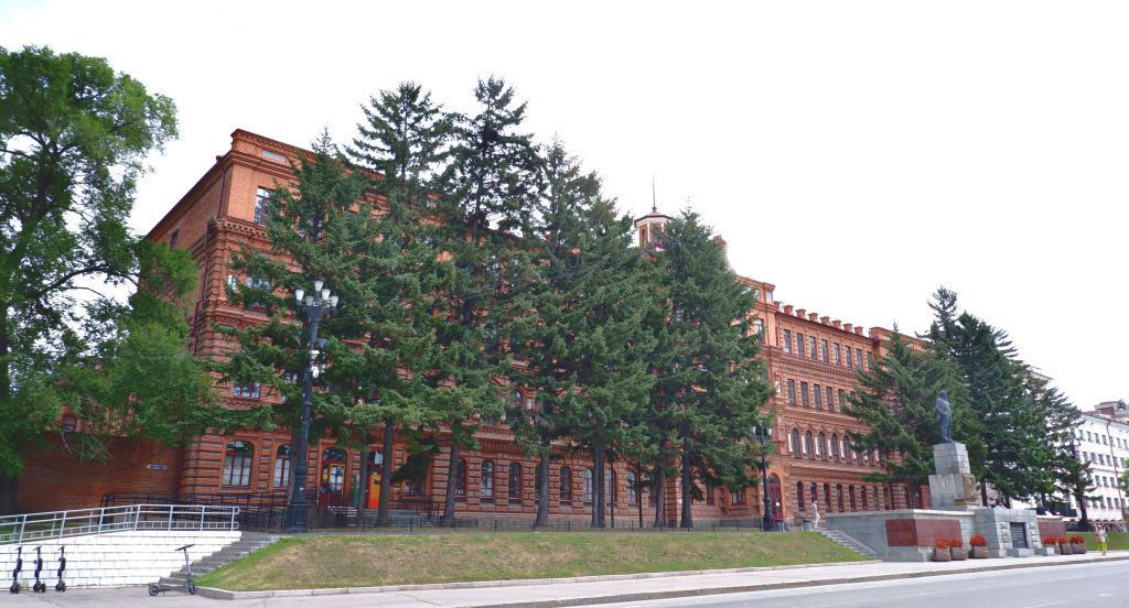 Градостроительная характеристика здания, являющегося частью градостроительного комплекса площади Ленина (главной площади Хабаровска), расположенного на северо-восточной ее стороне и участвующего в ее формировании своим главным, юго-восточным фасадом.Объемно-пространственная композиция 4-хэтажного с подвалом, Ш-образного в плане здания, с тремя двухэтажными пристройками с северо-восточной стороны.Конфигурация, габариты чердачной многоскатной вальмовой крыши с фальцевой гладкой металлической кровлей.Композиция и архитектурно-художественное оформление фасадов в стиле эклектики:центрально-симметричная композиция главного, юго-западного фасада в тридцать три оси оконных проемов, составленная тремя ризалитами (центральный и фланкирующие) по пять осей оконных проемов каждый с выступающим кубическим объемом главного входа по оси центрального ризалита, и двумя западающими частями между ризалитами, в девять осей каждая;композиция юго-восточного фасада: на переднем плане – четырехэтажная основная часть здания в шесть осей оконных проемов (три ниши и три окна), справа – пристройка, двухэтажная, двухчастная, разноплановая – западающая часть слева в пять осей оконных проемов (в уровень основного фасада), справа – выступающая часть в три оси оконных проемов. На среднем плане – основная часть, прорезанная четырьмя осями оконных проемов, четырехэтажная; протяженная, в восемь осей оконных проемов, визуально разделенная на четыре части лопатками – двухэтажная пристройка. На заднем плане – трехчастная, разноплановая: слева – основная часть здания, четырехэтажная, прорезана одной осью оконных проемов, пристройка справа – западающая, двухэтажная, в пять осей оконных проемов, визуально разделена лопатками на две части, центральная часть (пристройка) – в четыре оси оконных проемов, в двух плоскостях – нижняя (первый этаж) в уровень основной части здания, плоскость второго – дальше;композиция дворового, северо-восточного фасада разноплановая, состоит из пяти частей: трех торцевых крыльев, разного выноса (средняя часть – глухая, на первом плане, справа – в пять осей оконных проемов на втором плане, слева – в семь осей оконных проемов на третьем плане) и стоящего на заднем плане основного объема здания;композиция северо-западного фасада, состоящая из основного объема здания и трех разноплановых пристроек (аналогична композиции юго-восточного фасада).Декоративное оформление фасадов, выполненное в лицевой кирпичной кладке, в том числе:на главном, юго-западном фасаде:междуэтажные карнизы, единая подоконная полка второго и третьего этажей с сухариками;руст первого этажа со сколотыми боковыми гранями;рустованные лопатки второго и третьего этажей;ниши с поребриками;квадратные и прямоугольные ниши на центральном ризалите;в простенках третьего этажа ризалитов – короткие, круглые сдвоенные колонки с хомутами, увенчанные фризом с полочками, сухариками, кокошником;оформление средних окон ризалитов на втором этаже, украшенное кокошником из трех полочек и прорезным каменным узором за вертикальными наличниками;рамочные наличники окон первого, второго этажей ризалитов;наличники окон второго этажа между ризалитами: три круглых колонки с хомутами, увенчанные антаблементом, карниз которого сливается с кокошниками над архивольто