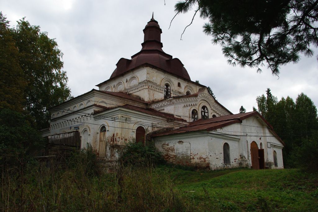1. Градостроительные характеристики здания: местоположение здания в центре села, в глубине участка между улицей Колхозной и склоном реки Вятки.2. Объёмно-пространственная композиция здания:2.1. Крестообразное в плане, состоящее из двенадцати условных блоков: северная апсида, южная апсида, центральная апсида, северный придел, южный придел, центральный блок, южная палатка, северная палатка, пристрой к северной палатке, пристрой к южной палатке, пристрой к центральному блоку, световая надстройка.2.2. Одноэтажное.2.3. Крыша скатная, чердачная. Металлическая кровля четверика в виде восьмигранного купола с одноглавием. Купол имеет декоративные аттики по сторонам света и уступ, разделяющий основной сферический объем и переходную «скоцию» к барабану главы. Кровля восьмигранного барабана главы уступчатая, имеет переходную «скоцию», представляющую собой гофрированную юбочку.3. Композиция и архитектурно-художественное оформление фасадов здания:3.1. Общие элементы:пилястры, каннелированные и поставленные на филенчатый постамент, опорой которого в уровне цоколя служит специальная выступающая кубышка (далее – пилястры);поддерживаемый пилястрами разделяющий карниз с зубчиками-кронштейнами и ярусом ложных закомар (кокошников), имеющих несколько вытянутую вверх форму (далее – разделяющий карниз);венчающий карниз типа 1 - простой профилированный венчающий карниз;венчающий карниз типа 2 в виде гладкой ленты с подзором из прямоугольных уступчатых зубцов, дополненной ярусом полуциркульных кокошников в виде гладких арок с четвертным валом;лента цоколя из прямых уступов кирпича (далее – ленты цоколя);оконные проёмы типа 1 имеют арочную форму и обрамлены гладким рамочным наличником прямоугольного сечения, украшены бровкой, повторяющей арочное завершение;оконные проёмы типа 2 имеют арочную форму и обрамлены гладким рамочным наличником прямоугольного сечения;оконные проёмы типа 3 имеют прямоугольную форму и обрамлены «ушастым» наличником сложного многоступенчатого профиля, украшены прямым сандриком на кронштейнах.3.2. Восточный фасад: три оси оконных проёмов типа 1южной апсиды;три оси оконных проёмов типа 1северной апсиды;три оси оконных проёмов типа 3 центральной апсиды;разделяющий карниз центрального блока;пилястры центрального блока, делящие его поле на три прясла, при этом по углам пилястры спаренные;фигурные вентиляционные отверстия центрального блока, расположенные над центральными пилястрами между ложных закомар;венчающий карниз типа 1, завершающий центральный блок;венчающий карниз типа 1, завершающий южную апсиду;венчающий карниз типа 1, завершающий северную апсиду;карниз с зубчиками-кронштейнами, завершающий центральную апсиду;простой профилированный карниз с одним кокошником, расположенным с угла, завершающий северный придел;простой профилированный карниз с одним кокошником, расположенным с угла, завершающий южный придел;пилястры, расположенные на углах центральной апсиды;пилястры, расположенные на углах северной апсиды; лента цоколя.3.2. Северный фасад:четыре оси оконных проёмов типа 1 северного придела;одна ось оконного проёма типа 1 северной палатки;одна ось оконного проёма типа 2 пристроя к северной палатке;разделяющий карниз центрального блока;пилястры центрального блока, делящие его поле на три прясла, при эт