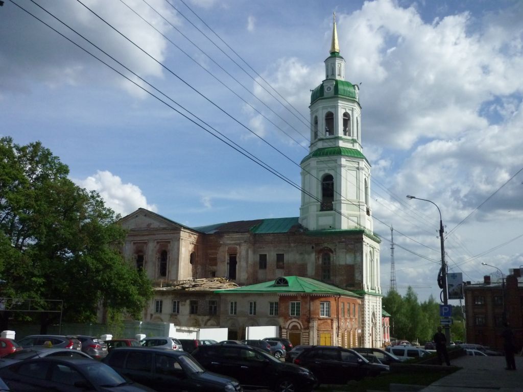 1. Градостроительная характеристика здания: местоположение здания, выступающего за красную линию улицы Большевиков (Казанской).2. Объемно-пространственная и планировочная композиция: двухэтажный собор, имеющий в плане форму креста, удлиненный в западном направлении в результате пристройки трапезной и колокольни над папертью; две палатки, пристроенные в начале XIX века с юга и с севера к колокольне; основные габаритные размеры памятника: длина – 47,5 м; ширина – 27,5 м; высота храма с учетом завершений – 51 м, колокольни – 57 м; каменные стены, сложенные из глиняного кирпича на известковом растворе. 3. Композиция и архитектурно-художественное оформление фасадов: ритмичное членение пилястрами фасадов здания на высоту двух этажей; треугольные фронтоны, оформленные в виде пилястровых портиков тосканского ордера, расположенные в торцевых рукавах креста объема здания; карнизы простого профиля, членящие здание по горизонтали в соответствии с внутренней организацией пространства; классический карниз, украшенный дентикулами и опоясывающий второй этаж памятника; высокие арочные и прямоугольные окна, акцентированные по 1 этажу замковыми камнями, ритмично прорезающие стены фасадов; рамочное обрамление оконных проемов, дополненные простыми филёнками над окнами первого этажа и прямоугольные ниши под окнами второго; богато оформленная рустом арка входа колокольни с замковым камнем над ней; пилястры, фланкирующие входную арку и закрепляющие с небольшим отступом углы колокольни, наложенные на крупный руст первого яруса; арочные оконные проемы по центру фасадов второго яруса колокольни, расположенные в арочных нишах обрамленных простым наличником завершенным замковым камнем, вписанных в свою очередь в прямоугольные ниши; глубокие и низкие полукруглые впадины между пилястрами с простыми по геометрии сандриками над ними; простые сдвоенные карнизы, разделенные широким плоским фризом опоясывающие все четыре яруса колокольни и прерывающиеся пилястрами в уровне первого и третьего ярусов; арочные проемы на четыре и на восемь сторон в восьмигранном объеме третьего и четвертого яруса колокольни соответственно с завершением замковым камнем, расположенные в прямоугольных нишах фланкированных пилястрами; прямоугольные ниши на восемь сторон, расположенные под проемами третьего и четвертого яруса колокольни; прямоугольные ниши на четыре стороны в уровне арочных проемов третьего яруса колокольни; восьмигранный купол колокольни с лучковыми люкарнами на четыре стороны света; восьмигранная главка с четырехгранным пирамидальным шпилем колокольни; полутораэтажный объем южной палатки, решенный в классическом стиле: лучковые оконные проемы цокольного этажа; арочные оконные проемы первого этажа, обрамленные сверху полуциркульными карнизами и рустовкой в простенках; под арочными проемами первого этажа расположены прямоугольные филенки с круглым теснением в центре; скругленный юго-западный угол южной палатки, ограниченный сдвоенными пилястрами на всю высоту первого этажа; прямой тянутый карниз с широким фризом; двухэтажный объем северной палатки, решенный в классическом стиле: прямоугольные дверные проемы первого этажа, обрамленные широким полуциркульным карнизом с плоским фризом сверху и рустовкой в простенках; прямоугольные око