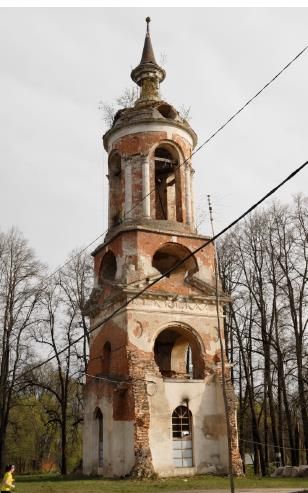 - ландшафтно-градостроительная характеристика частично сохранившегося здания, утратившего объемы храма, трапезной и боковых палаток колокольни, являющегося вертикальной доминантой обширного окружающего ландшафта;- объемно-пространственная композиция колокольни – сохранившаяся часть церкви, утратившей объемы храма, трапезной и боковых палаток колокольни, следы примыкания которых сохранились на ее стенах – отличающаяся стройностью и состоящая из высокого нижнего четверика, верхнего четверика со срезанными углами и высокого ротондального верхнего яруса звона, увенчанного куполом со шпилем на шейке, несущим яблоко;- количество, осевое расположение, габариты и арочная форма проемов;- материал капитальных стен – кирпич, белокаменные детали декора;- композиционные решения и оформление симметричных фасадов:- нижний четверик: на западном фасаде – высокая арка главного входа, фланкированная выступами, которые увенчаны развитыми карнизами импостов;овальные нишки с лепными розетками, помещенные по сторонам арочного изгиба; на боковых фасадах над палатками – аналогичные арки с боковыми нишками; на всех фасадах – завершающие белокаменные полные антаблементы с лепными гирляндами во фризе и треугольные фронтоны с профилированными карнизами, которые поддерживаются модульонами;- верхний четверик: белокаменные круглые трибуны у срезанных углов четверика, полукруглые окна с белокаменными замками и венчающий карниз простого профиля;- ротондальный ярус: высокие арочные проемы с белокаменными замками; в простенках - парные белокаменные коринфские полуколонны, поддерживающие раскрепованную верхнюю часть ротонды с овальными нишками, выложенными на осях простенков; белокаменный антаблемент с гладким фризом и профилированной карнизной плитой, увенчанной аттиком, в котором прорезаны круглые люкарны купола; шейка с небольшим перетягом, сужающаяся кверху и несущая шпиль, с одной из окружавших ее восьми белокаменных тосканских колонн, несших сохранившуюся массивную белокаменную тарель профилированного карниза; в проемах яруса звона –скромные решетки ограждения и балки для подвески крестов;- поверхности наружных стен со следами штукатурки и окраски в светлый тон;- в интерьерах – сводчатые перекрытия ярусов.