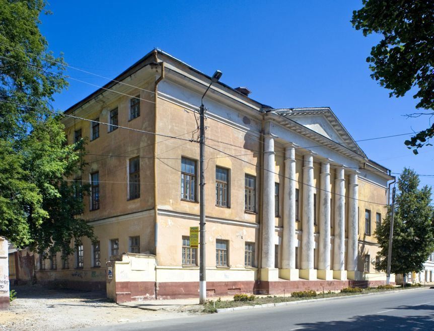 Главный дом с воротами:Объемно-пространственная композиция здания: - прямоугольный в плане, вытянутый по оси восток-запад, трехэтажный (с подвалом под восточной частью) основной объем с портиком по оси южного фасада;- прямоугольные в плане, вытянутые по оси восток-запад, трехэтажные крылья на флангах северного фасада (западное крыло, со скошенными углами, выстроено с отступом от угла основного объема);конструкции (вальмовая крыша основного объема с элементами двухскатных крыш над портиком южного фасада и по оси северного фасада; полувальмовые крыши крыльев), материалы, характер кровельного покрытия (железное, фальцевое, окрашенное) крыш здания;- прямоугольные в плане пилоны проездных ворот, фланкированные пряслами ограды, примыкающие к левому флангу восточного фасада основного объема, расположенные по линии застройки.Композиция и архитектурно-художественное оформление фасадов:- по оси главного, - одиннадцатиосного, - южного фасада устроен шестиколонный портик тосканского ордера с треугольным фронтоном; фасады основного объема и крыльев расчленены простым подоконным карнизом в уровне первого этажа, профилированным междуэтажным – между первым и вторым этажами; венчает фасады основного объема и восточного крыла северного фасада профилированный карниз со свесом, дополненный по южному фасаду фризом; западное крыло венчает профилированный карниз; над свесом крыши основного объема и восточного крыла устроен парапет;- цоколь;- декор шестиколонного портика южного фасада: ризалит; кубовидные базы колонн; трехчетвертные колонны тосканского ордера с квадратными абаками; полный антаблемент (свес поддержан рядом мутул); треугольный фронтон, увенчанный профилированным карнизом со свесом, поддержанным рядом мутул;- простой подоконный карниз в уровне первого этажа;- профилированный междуэтажный карниз (над первым этажом);- профилированный венчающий карниз основного объема и восточного крыла, со свесом, по южному фасаду дополненный фризом;- профилированный венчающий карниз западного крыла;- треугольный фронтон, устроенный по оси северного фасада основного объема, завершенный профилированным карнизом со свесом;- парапет, устроенный над всеми фасадами основного объема и восточного крыла, разорванный фронтонами южного и северного фасадов основного объема;- треугольный зонт (металл, ковка) над дверным проемом восточного фасада восточного крыла, поддержанный консолями с солярной символикой, с подзором и фронтоном, украшенными растительным орнаментом;- декор ворот с оградой: цоколь пилонов ворот и прясел ограды; проемы калиток с полуциркульным завершением, прорезанные по осям пилонов; рустованная поверхность южных фасов прясел ограды; простой карниз, членящий южные фасы пилонов в уровне пят арок проемов калиток, сочлененный с рустованными полуциркульными архивольтами проемов; сегментный, с плечиками, профилированный венчающий карниз пилонов; Количество, расположение, габариты, конфигурация оконных и внешних дверных проемов здания (современное состояние):основной объем – семьдесят три оконных и один дверной проем (все – прямоугольные); восточное крыло северного фасада – семь оконных и один дверной проем (все – прямоугольные); западное крыло северного фасада - пять оконных и один дверной проем (все – прямоугольные).Истори