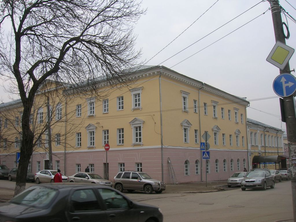 Местоположение и градостроительные характеристики здания, замыкающего с юго-востока перекресток улиц Театральной и Карпова, его роль в композиционно-планировочной структуре квартала.Объемно-пространственная композиция здания:- прямоугольный в плане, вытянутый по оси север-юг, трехэтажный (с подвалом) первоначальный объем;- прямоугольный в плане, вытянутый по оси север-юг, трехэтажный флигель (северный);- прямоугольная в плане, вытянутая по оси восток-запад, трехэтажная (с подвалом под западной частью) пристройка к правому флангу восточного фасада первоначального объема, соединяющая последний с флигелем;- Г-образный в плане, вытянутый по оси север-юг, двухэтажный (с подвалом) флигель (южный), примыкающий к южному фасаду первоначального объема;- прямоугольная в плане, вытянутая по оси восток-запад, двухэтажная пристройка, примыкающая к восточному фасаду крыла южного флигеля;- фрагмент ограды, расположенный по южной границе усадьбы, примыкающий к левому флангу восточного фасада пристройки к южному флигелю;- конструкция (двухскатные крыши первоначального объема, северной пристройки, южного флигеля; двухскатная крыша северного флигеля с таковым же элементом над южным фасадом; скатная крыша пристройки к южному флигелю), материал, характер кровельного покрытия (железное, фальцевое, окрашенное) крыши здания;- печные трубы, расположенные по восточному скату крыши северного флигеля и по коньку южного флигеля;- слуховые окна, расположенные по западному и восточному скатам крыши первоначального объема, южному скату крыши северной пристройки, восточному скату крыши южного флигеля.Композиция и архитектурно-художественное оформление фасадов:- главные фасады первоначального объема (восьмиосный западный и пятиосный северный), северного флигеля (четырехосный северный), северной пристройки (семиосное прясло, фланкированное одноосным и трехосным ризалитами) расчленены профилированным междуэтажным карнизом (над первым этажом), увенчаны профилированным карнизом со свесом, поддержанным мутулами, разорванным трехосным ризалитом, который завершен треугольным фронтоном; главный фасад южного флигеля, - западный, девятиосный, - фланкирован и неравномерно расчленен лопатками, в горизонтальной плоскости расчленен профилированным междуэтажным карнизом и увенчан профилированным раскрепованным карнизом с гладким фризом;- трехосный ризалит (объем междуэтажной лестницы), расположенный на правом фланге северного фасада северной пристройки;- одноосный ризалит (объем междуэтажной лестницы), расположенный на левом фланге северного фасада северной пристройки;- одноосная ниша с полуциркульным завершением, расположенная на левом фланге южного фасада северной пристройке в уровне двух этажей;- цоколь всех объемов здания;- лопатки, расположенные на левом фланге северного фасада и на правом фланге западного фасада северного флигеля в уровне двух этажей;- лопатки, фланкирующие и членящие (в границах входного объема) западный и восточный фасады южного флигеля; лопатки, фланкирующие входной объем по западному фасаду, оформлены нишами - в уровне первого этажа в нижней трети – прямоугольными горизонтальными, в уровне обоих этажей в двух верхних третях – прямоугольными вертикальными; также в уровне верхних двух третей, - в уровне обоих этажей, - лоп