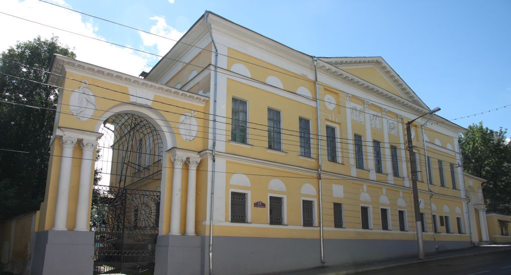 Местоположение и градообразующие характеристики здания, формирующего фронт застройки ул. Пушкина. Объемно-пространственная композиция здания: - прямоугольный в плане, с ризалитами по оси северного фасада и на флангах южного фасада, вытянутый по оси восток-запад, двухэтажный объем с неполным третьим этажом (антресолями), с подвалом под восточной частью здания; - конструкция (вальмовая с элементами двухскатной над ризалитами), материал, характер кровельного покрытия крыш здания (изначально – железное, фальцевое, окрашенное); - три печные трубы, расположенные по коньку крыши, две печные трубы, расположенные на восточной и западной вальмах; - три слуховых окна, расположенные по южному скату крыши и по вальмам. Композиция и архитектурно-художественное оформление фасадов: - по оси главного, северного – одиннадцатиосного – фасада устроен пятиосный ризалит; - в уровне всех этажей главный фасад фланкирован лопатками, расчленен простым подоконным карнизом в уровне первого этажа и профилированными междуэтажными карнизами; - восточный и западный фасады – пятиосные, центральная часть южного фасада (семиосная) фланкирована трехосными ризалитами; - центральная часть ризалита северного фасада и ризалиты южного фасада в уровне второго этажа фланкированы и расчленены пилястрами коринфского ордера; - венчает фасады и треугольные фронтоны ризалитов профилированный раскрепованный карниз со свесом и гладким фризом; - цоколь здания; - декор крылец восточного и западного фасадов: белокаменная площадка крыльца с ведущей к ней одномаршевой белокаменной лестницей; перила (металл), поддержанные изогнутыми консолями (металл) с завитками (поле перил и консолей заполнено элементами в форме окружностей и завитков); шестигранные фонари (чугун, литье), имеющие цилиндрическое основание с утонченной шейкой, четырехгранное навершие (основание, подзор фонарей, навершие оформлены растительным орнаментом);двухскатный зонт крыльца (металл) западного фасада - с подзором, поддержанным изогнутыми консолями (поле консолей, подзора и фронтона заполнены элементами солярной символики, окружностями и завитками);двухскатный зонт крыльца (металл) восточного фасада - с подзором, поддержанным изогнутыми консолями (поле консолей, подзора и фронтона заполнены элементами солярной символики, окружностями и ромбами); - декор пятиосного ризалита, расположенного по оси северного фасада: трехосная ниша, устроенная в уровне первого этажа; простой раскрепованный подоконный карниз; прямоугольные вертикальные ниши, в которых прорезаны оконные проемы трехосной ниши; ниши, устроенные над оконными проемами первого этажа – полуциркульные, завершенные массивными замковыми камнями, над центральными оконными проемами ризалита, прямоугольные горизонтальные – над фланговыми проемами; - рустованная поверхность ризалита (французский руст) в уровне первого этажа с имитацией веерных замковых камней над центральными оконными проемами; - профилированный междуэтажный карниз; - трехосная ниша, устроенная в поле второго этажа; - пилястры коринфского ордера, фланкирующие и членящие указанную нишу (постаменты пилястр достигают подоконного уровня, завершены профилированным карнизом); профилированные подоконные полочки центральных оконных проемов второго этажа;- прямоугольные ниши, 
