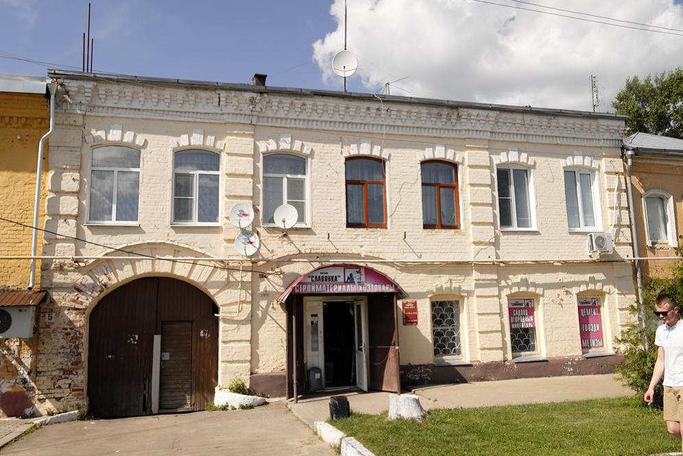 - градостроительная характеристика здания, расположенного на северной стороне площади в сплошном однородном ряду домов, формирующем пространство площади;- объемно-пространственная композиция немного вытянутого вдоль площади 2-этажного здания с непрямыми в плане углами и проездной аркой, примыкающего боковыми стенами к соседним домам, перекрытого вальмовой крышей и дополненного деревянной пристройкой к дворовому фасаду, включающей междуэтажную лестницу, и 1-этажной дворовой пристройкой (флигелем) с небольшим подвалом, перекрытой на 2 ската; высотные отметки по коньку кровли;- количество, осевое расположение, габариты и форма входных, оконных проемов и проездной арки основного объема и 1-этажной пристройки;- материал капитальных стен – кирпич;- композиционное решение и оформление главного фасада с симметричной организацией 2-го этажа - рустованные лопатки, членящие фасад на 3 прясла, обрамление перемычки проездной арки и входа крупным рустом, переходящим в плоскость лопаток, и пояском-архивольтом несложного профиля, переходящим на другие прясла и членящим фасад; над оконными проемами крупные замки и расходящийся по всей дуге руст; венчающие фриз с пилой и карнизом на городках, связанных арочками;- поверхности наружных стен – окраска главного фасада в бежевый цвет с побелкой деталей декора, лицевая кладка кирпича на дворовом фасаде, штукатуркаи окраска в светлый тон пристройки;- пространственно-планировочная структура интерьера: на 1-м этаже торговое помещение лавки и ее подсобное помещение, разделенные продольной стеной; на 2-м этаже помещения, образованные продольной осевой стеной и поперечными стенами, по преимуществу соответствующими фасадным лопаткам; объемы печей, включая угловую печь в юго-западной комнате; перекрытие проездной арки сложенными из кирпича параллельными лучковыми сводиками на балках.