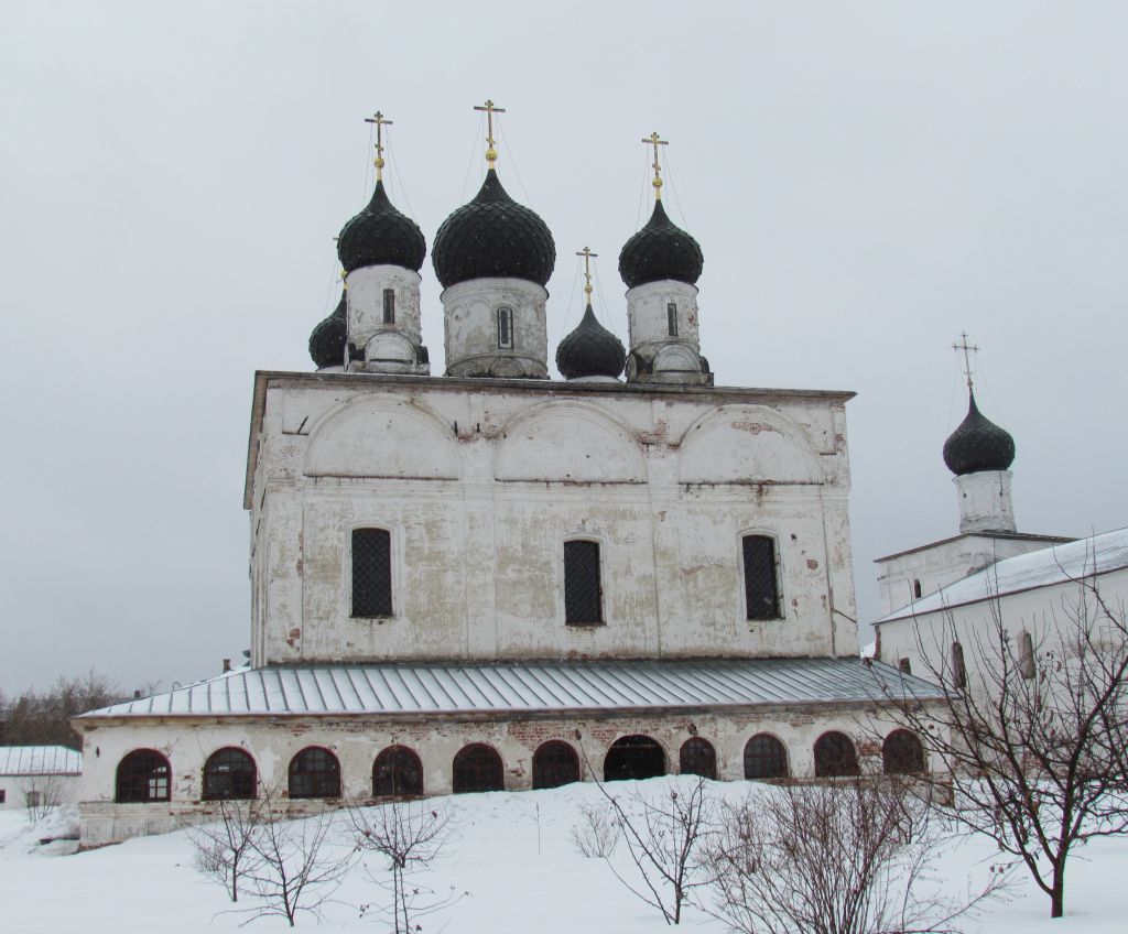 1. Градостроительные характеристики (приложение №1 ): 1) входит в состав объекта культурного наследия федерального значения «Ансамбль Макарьево-Унженского монастыря», 1670-1755 гг.: Никольская церковь, 1685 г.; Церковь Успения, 1735 г.; Троицкая церковь, 1670 г.; Церковь Макария, 1674 г.; Церковь Благовещения, 1680 г.; Кельи, XVII в.; Башни, 1755 г. 2) территория монастыря сложной в плане формы, ограниченная по периметру монастырскими стенами ограды; с юго-запада, юга, юго-востока и северо-востока расположена по границе оврага; 3) месторасположение Троицкой церкви в центре территории ансамбля.2. Стилистические особенности объекта: пример крупного монастырского храма 2-й половины 17 века. 3. Объемно-пространственная композиция здания, образованная следующими объемами (приложение №2 ): 1) прямоугольным в плане четырехстолпным двусветным четвериком (восточные столбы устроены в алтарной преграде), под четырехскатной пологой кровлей, увенчанной пятью чешуйчатыми луковичными главами; 2) трехапсидным алтарем, примыкающим к четверику с востока, апсиды перекрыты конусовидными кровлями; 3) одноэтажной галереей, крытой на один скат, примыкающей к объему четверика с запада и севера. 4. Архитектурные характеристики (приложение №3 к ): 4.1. Северо-западный фасад: 1) композиция фасада, построенная на доминирующем объеме двусветного четверика, завершенного четырехскатной кровлей, увенчанной пятью луковичными главами с крестами на барабанах (центральная глава - более массивная, с узкими прорезями окон по четырем сторонам света; угловые барабаны по юго-западному фасаду также световые); плоскость фасада четверика делится пилястрами на четыре прясла (второе, третье и четвертое прясло в уровне первого яруса перекрыто объемом одноэтажного гульбища в восемь осей (восьмая ось – дверной проем), под скатной кровлей); с востока к объему четверика примыкает алтарь;месторасположение, размер и форма оконных и дверных проемов четверика (дверной проем в первом прясле в уровне первого яруса; перспективный портал входа во втором прясле в уровне первого яруса; оконные проемы во втором, третьем и четвертом прясле в уровне второго яруса);месторасположение, размер и форма оконных проемов алтаря;месторасположение, размер и форма оконных и дверных проемов гульбища (восемь осей, восьмая ось – дверной проем);размер и форма кровель четверика, алтаря, гульбища;месторасположение, размер и форма луковичных главок на барабанах;2) декор северо-западного фасада:профилированный цоколь четверика и алтаря;профилированный карниз, дополненный рядом поребрика, опоясывающий объем четверика и алтаря;венчающий карниз алтаря, дополненный рядом «бегунца»;профилированные штукатурные наличники оконных проемов второго света четверика;профилированный карниз, отделяющий второй ярус четверика от закомар;пилястры четверика, раскрепованные в уровне цоколя, междуярусного карниза, и карниза, отделяющего второй ярус от закомар;профилированный кладочный декор закомар;венчающий профилированный карниз четверика, крепующий пилястры в простенках между закомарами;цилиндрические угловые барабаны на квадратных в плане постаментах, украшенные по четырем сторонам полуциркульными кокошниками в нижней части, пояском из полувалика над ними, аркатурно-колончатым пояском и венчающим карнизом;цилиндрический центральн