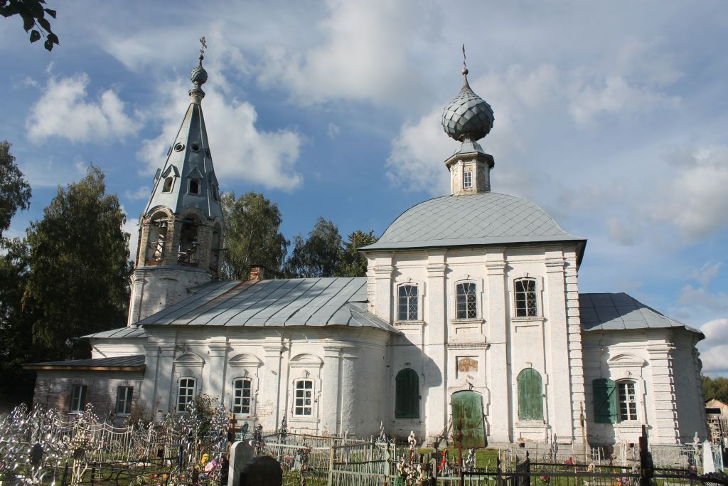 1.Связь с ландшафтом и архитектурно-художественным ансамблем окружающих построек:церковь расположена на северной окраине села, на территории действующего кладбища, обнесена металлической оградой с воротами. 2. Стилистические особенности объекта: 1)характерный для Костромского региона образец сельской приходской церкви. Небольшая церковь с бесстолпным одноглавым храмом, бесстолпной трапезной и шатровой колокольней;2) архитектура церкви сочетает черты позднего борокко (храм и трапезная) и традиции зодчества XVII в. (колокольня);3. Объемно-пространственная и планировочная композиция здания в габаритах капитальных стен и перекрытий:1) протяженность основных объемов по оси запад-восток, исторические формы и габариты основных объемов, их пропорциональное соотношение;2)основные габариты церкви (в метрах): длина ~ 31,6; ширина ~ 14,0; высота ~ 24,0;3)двусветный четверик храма с пониженной алтарной частью завершён восьмигранным световым барабаном с луковичной главкой; 4)одноапсидный, гранённый алтарь с полукружием в центре восточного фасада; 5)прямоугольный, поперечно вытянутый в плане, объем трапезной со скруглёнными восточными углами. В составе трапезной один южный придел Святителя Николая; 6)миниатюрная трехъярусная колокольня, типа 2-х ярусный восьмерик (нижний ярус глухой, верхний прорезан арками звона) на четверике под шатровым завершением, увенчанная луковичной главкой с крестом на цилиндрическом глухом барабане;4. Композиционное решение, включая местоположение, форму, размер и оформление оконных и дверных проемов, междуэтажные пояса и карнизы, венчающий карниз, материал и характер отделки фасадных поверхностей конца XIII в. (красный кирпич, известковая обмазка, дерево, металл), колористическое решение фасадов конца XIII в. (уточняется в процессе реставрационных работ):1) система вертикальных членений членения фасадов:1.1) четверика храма - трехосная симметричная композиция северного и южного фасадов: в уровне первого света оконные проемы по 1-й и 3-й осям, входной проем по 2-й оси, (со стороны северного фасада дверной проём заложен); в уровне второго света по три оконных проема;1.2) алтаря - трёхосная композиция оконных проёмов по трём сторонам света ( север, юг, восток);1.3) трапезной - симметричная композиция северного и южного фасадов в три оси оконных проемов; 1.4) колокольни - широкий арочный входной проем с западной стороны 1-го яруса;5. Архитектурно-художественное и декоративное решение фасадов:1) одиночные гладкие пилястры в простенках между оконными проёмами и по краям объёма, во всю его высоту, с северного и южного фасадов (по четыре с каждой стороны) четверика храма;2) гладкие сдвоенные пилястры на гранях светового барабана, венчающего четверик храма;3) одиночные, гладкие, пилястры в простенках между оконными проёмами и сдвоенные по краям трапезной;4) рустованные одиночные пилястры, слева и справа от центрального (восточного) проёма и по краям с северной и южной стороны объёма алтаря; 5) гладкие сдвоенные пилястры на гранях нижней части 2-го яруса (восьмерика) колокольни;6) рустованные углы, на всю высоту четверика храма; 7) рустованные углы с северной и южной стороны, алтаря; 8) вертикальные филёнки, связывающие нижние и верхние оконные проёмы (на северном и южном фасадах) четверика храма; 9) арочное завершение оконных и дверного проёма в уров