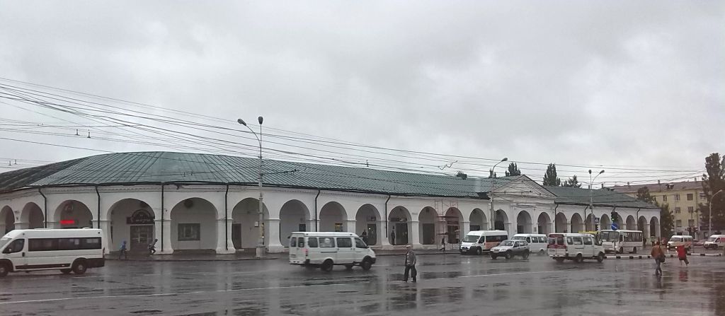 Связь с ландшафтом и архитектурно-художественным ансамблем окружающих построек (приложение к настоящему предмету охраны):1) входит в состав объекта «Ансамбль Торговых рядов и других зданий центральной части города», XVIII-XIX вв.;2) расположен в центральной части города на возвышенном месте вблизи реки Волги.;3) участок, ограниченный ул. Островского, Сусанинским сквером, пр. Текстильщиков и линией жилой застройки со стороны северо-западного фасада;4) рельеф участка спокойный с понижением в западном направлении;5) вытянутое каре по линии северо-восток - юго-запад, по объемной композиции.2. Стилистические особенности объекта (приложение к настоящему предмету охраны): ранний классицизм конца XVIII века.3. Объемно-пространственная и планировочная композиция (приложение к настоящему предмету охраны):1) двухэтажное, кирпичное, оштукатуренное с главных, и обмазано с дворовых фасадов здание с подвалами и двускатной кровлей; в плане имеет форму крупного замкнутого каре со скругленными углами, обрамленное галереей/аркадой по внешнему контуру;с юго-восточной стороны дворового фасада пристроены торговые помещения лавок в два этажа, с остроугольной кровлей на два ската каждая;2) в плане корпус состоит из отдельных помещений лавок, образованных внутренними поперечными стенами, которые расчленяют их на отдельные секции;3) общий габарит здания: по юго-западному фасаду - 124,87 п.м., по северо-западному фасаду - 164,36 п.м., по северо-восточному фасаду - 122,85 п.м., по юго-восточному фасаду - 164,25 п.м.;габариты здания по дворовым фасадам:по юго-западному фасаду 85,25 п.м.;по северо-западному фасаду 137,61 п.м.;по юго-восточному фасаду 136,60 п.м.;по северо-восточному фасаду 81,49 п.м.;4) высотная отметка здания от уровня земли до подшива кровли (главные фасады) по южному углу - 5,62 м., по восточному углу - 5,44 м., по северному углу - 7,10 м., по западному углу - 6,14 м.;высотные отметки дворовых фасадов от уровня цоколя до подшива:северо-восточный фасад - 5,81 м.;юго-восточный фасад - 5,91 м.;юго-западный фасад - 5,81м., со стороны 2-х этажной пристройки - 5,96 м.;северо-западный фасад - 5,56 м.4. Композиционное решение фасадов (приложение к настоящему предмету охраны, нумерация проемов согласно приложению):4.1. Северо-восточный фасад:1) плоскость фасада основного объема симметрична, трехчастная композиция модульного вертикального членения фасадов с повторяющимся ритмом аркады рядов по периметру здания;2) 23 арки открытой галереи;3) 22 проема основной стены в уровне 1-го этажа по осям арок галереи;4) 23 круглых оконных проема основной стены фасада в уровне 2-го этажа;5) 11, 12, 13 проемы объединены в центральный трехчастный портик, завершенный треугольным фронтоном;6) 12 проем в уровне 1-го этажа - сквозной арочный проезд по центру фасада.4.2. Юго-восточный фасад:1) плоскость фасада основного объема симметрична, трехчастная композиция модульного вертикального членения фасадов с повторяющимся ритмом аркады рядов по периметру здания;2) 29 арок открытой галереи;3) 28 проемов основной стены фасада в уровне 1-го этажа;4) 28 круглых оконных проемов основной стены фасада в уровне 2-го этажа;5) 14, 15, 16 проемы объединены в центральный трехчастный портик, завершенный треугольным фронтоном;6) 15 проем - сквозной арочный проезд, проходящий по центру фасада здания.4.3. Юго-западный фасад:1) плоскость фасада основного объема симметрична, трехчастная ко