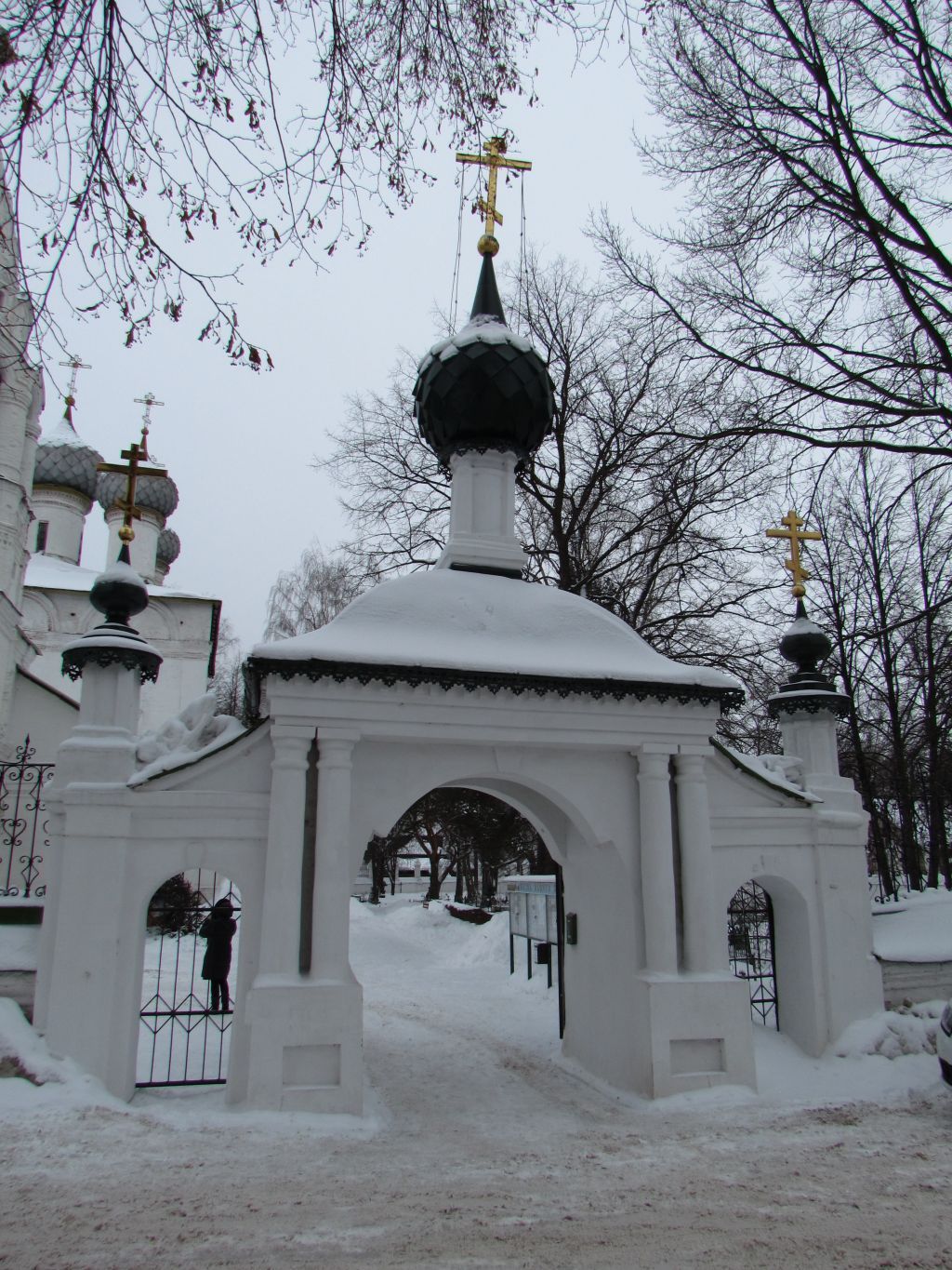 Предметом охраны является:1.Связь с ландшафтом и архитектурно-художественным ансамблемокружающих построек:включены в ограду с западной стороны, являются главными воротами и неотъемлемой частью архитектурно-художественного ансамбля церкви Иоанна Богослова.2.Стилистические особенности объекта: провинциальное барокко с элементами классицизма.3.Объемно-пространственная и архитектурно-художественная композиция объекта: ворота с тремя арочными пролетами (два боковых – калитки) с венчающей чешуйчатой луковичной главкой на тонкой шейке над центральной аркой проезда и гладкими луковичными главками над калитками, увенчанными крестами. 4.Декоративные детали убранства фасадов: 1) парные колонны тосканского ордера на цокольных основаниях с горизонтальными прямоугольными нишами, фланкирующие центральную арку проезда со стороны западного фасада;2) прямоугольные вертикальные ниши, фланкирующие центральную арку проезда со стороны восточного фасада;3) трехчастный карниз с сухариками, венчающий центральный объем ворот;4) клинчатый замковый камень, акцентирующий центральную и боковые арки со стороны западного фасада;5) декоративное оформление при переходе от центрального объема к калиткам в виде разносторонней треугольной конструкции;6) широкие плоские пилястры слева от левой и справа от правой калиток;7) простой карниз, венчающий объемы калиток;8) узкие цилиндрические шейки главок с венчающим валиком, с четырех сторон акцентированные выступающими лопатками, на ступенчатых постаментах. 5.Конструктивные особенности: 1) четырехлотковый свод, венчающий центральный объем ворот;2) защитное покрытие главок и перекрытия ворот из листового железа;6.Материалы строительства и штукатурной отделки фасадов:глиняный кирпич, известковая обмазка.7.Предмет охраны может быть дополнен при проведении научно - реставрационных работ.