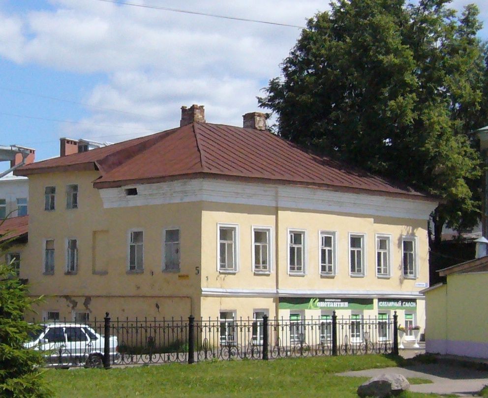 1. Предметом охраны объекта культурного наследия является двухэтажное с антресолями над северо-восточной частью основного объема здание, Т-образное в плане; капитальные стены кирпичные, оштукатуренные снаружи по основному объему.2. Стилистические особенности объекта:1) пример провинциальной жилой архитектуры в стиле позднего классицизма;2) объемно-пространственная композиция, сформированная в ходе строительства и перестроек к посл. четв. XIX в.3. Связь с ландшафтом и архитектурно-художественным ансамблем окружающих построек:1) здание расположено на территории, имеющей спокойный рельеф;2) объект расположен в центральной части г. Кострома, главный (юго-западный) фасад здания расположен по красной линии застройки, определяя архитектурный облик площади Воскресенская.4. Объемно-пространственная и планировочная композиция Т-образного в плане здания в габаритах капитальных стен и перекрытий под самостоятельными крышами над основным объемом и пристройкой:1) основной объем - двухэтажный с антресолями прямоугольный в плане; северо-восточная пристройка к основному объему - двухэтажная Т-образная в плане;2) общий габарит по юго-западному фасаду - 15,2 м, по северо-западному фасаду - 20,66 м, по северо-восточному фасаду - 15,2 м, по юго-восточному фасаду - 20,81 м; высотная отметка здания основного объема от нижнего уровня окон 1-го этажа до свеса кровли над вторым этажом по южному углу - 6,66 м, по восточному - 6,69 м, по северному - 6,68 м , по западному - 6,68 м;высотная отметка здания основного объема от нижнего уровня окон 1-го этажа до свеса кровли над антресолью по южному углу - 7,6 м, по восточному - 7,56 м, по северному - 7,67 м, по западному - 7,58 м;высотная отметка северо-восточной пристройки от нижнего уровня окон 1-го этажа до свеса кровли по северному углу - 5,09 м, по западному - 4,49 м, по восточному - 5,09 м, по южному - 4,9 м.5. Композиционное решение фасадов:1) юго-западный фасад:композиция фасада основного объема симметрична в 7 осей оконных проемов в уровне 1-го и 2-го этажей; центральная часть в 3 оси раскрепована небольшим ризалитом;2) северо-западный фасад:фасад представлен высоким полем стены основного объема с антресолями со стороны левого фланга и более низкой пристройкой;2 оконных проема в уровне 1-го этажа, 5 - в уровне 2-го этажа, 2 - в уровне антресоли основного объема;2 дверных проема в уровне 1-го этажа, 3 оконных проема в уровне 2-го этажа объема пристройки;небольшой прямоугольный проем (продух) в уровне венчающего карниза;3) северо-восточный фасад:на фасаде основного объема 6 оконных проемов в уровне антресоли;на фасаде пристройки 4 оси оконных проемов в уровне 1-го и 2-го этажей;1 оконный проем в уровне 2-го этажа пристройки с левого фланга;4) юго-восточный фасад:фасад представлен высоким полем стены основного объема с увеличением высоты с правого фланга и более низкой пристройкой;5 проемов в уровне 1-го этажа, 5 оконных проемов в уровне 2-го этажа, 2 - в уровне антресоли основного объема;1 оконный проем в уровне 1-го этажа, 1 оконный проема в уровне 2-го этажа объема пристройки;небольшой прямоугольный проем (продух) в уровне венчающего карниза.6. Архитектурно-художественное оформление фасадов, включая форму, размер, расстекловку и оформление оконных и дверных проемов:1) юго-западный фасад:междуэтажный профилированный карниз;развитый венчающий карниз;окна второго этажа с рамочн