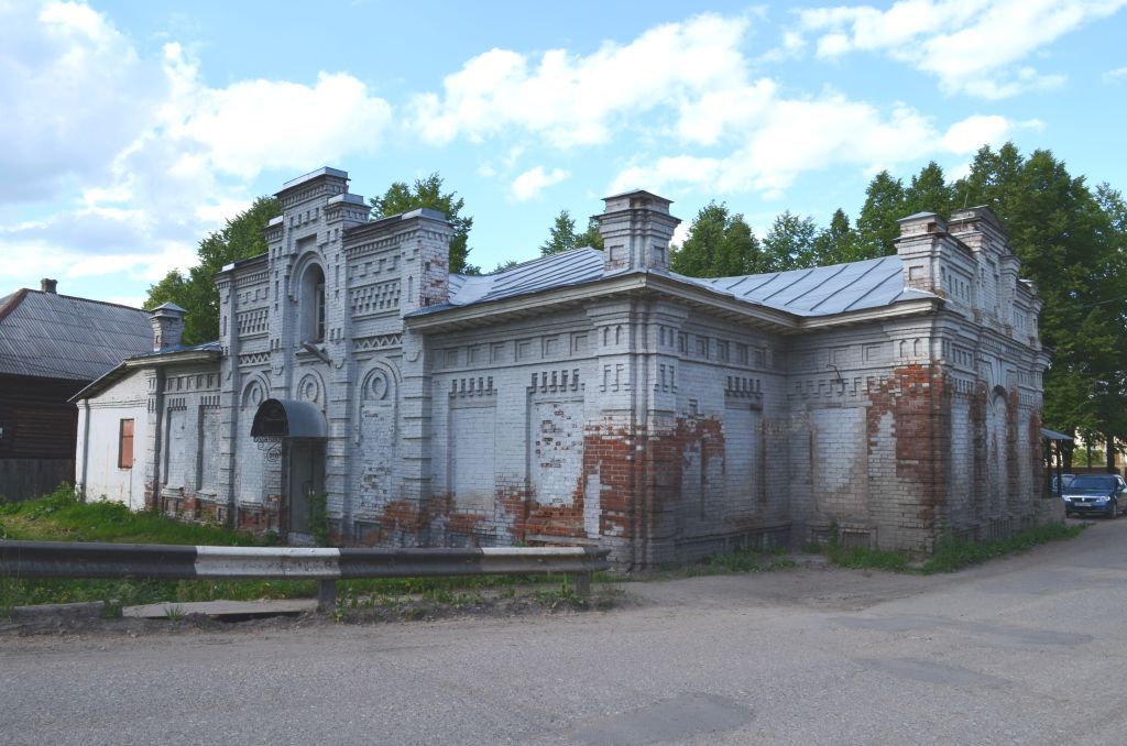 1. Одноэтажное кирпичное побеленное здание, прямоугольное в плане с подвалом.2. Связь с ландшафтом и архитектурно-художественным ансамблем окружающих построек:1) в центральной части деревни Шокши на берегу реки Шокши;2) расположен вдоль линии застройки улицы.2. Стилистические особенности объекта - эклектика - «кирпичный стиль».3. Объемно-пространственная и планировочная композиция:1) объем одноэтажный с подвалами в западной части здания, прямоугольный в плане основной объем со значительным выступом ризалита по центру юго-восточного фасада, с вальмовой крышей;2) общий габарит здания: по юго-восточному фасаду - 17,90 п.м., по северо-восточному фасаду - 22,16 п.м., по северо-западному фасаду - 18,27 п.м., по юго-западному фасаду - 22,15 п.м.;3) высотная отметка здания от уровня земли до подшива кровли по южному углу - 4,50 м., по восточному углу - 4,67 м., по северному углу - 4,9 м., по западному углу - 4,8 м.4. Композиционное решение фасадов:1) юго-восточный фасад:симметричная, трехчастная композиция;8 проемов (1 - ниша, 2 - проем, 3-6 - проемы в ризалите (4-5 - сдвоенные проемы), 7 - проем, 8 - ниша;2) северо-восточный фасад:плоскость фасада основного объема симметрична, трехчастная композиция;оконный проем по центру тимпана фронтона;3) юго-западный фасад:плоскость фасада основного объема симметрична, трехчастная композиция;8 проемов (1-7 - проемы основного объема, 8 - проем в ризалите (объем с отступом от линии фасада);чердачный оконный проем по центру аттика;4) северо-западный фасад:симметричная, трехчастная композиция;оконный проем по центру тимпана фронтона.5. Архитектурно-художественное оформление фасадов, включая форму, размер, расстекловку и оформление оконных проемов:1) юго-восточный фасад:цоколь невысокий гладкий (1);перспективные ширинки под оконными проемами (2);вертикальные прямоугольные нишки под оконными проемами 4-5 (3);горизонтальные ниши под оконными проемами 3,6 (4);горизонтально рустованные пилястры с языками-наплывами в верхней части и капителями с фигурными нишками - по углам основного объема здания, ризалита и по флангам от сдвоенных 4, 5 проемов (5);профилированная, фигурная ниша по флангам 1,8 (6);руст с имитацией клинчатого замка над сдвоенными окнами в центральной части ризалита фасада (7); трехчастный ступенчатый аттик с венчающим профилированным карнизом, в центральной части крестообразная ниша, в боковых частях - вертикальные нишки (8);профилированные аттиковые тумбы с филенкой по углам объема (9);карниз в центральной части ризалита оформленный рядом дентикул (10);сдвоенные полукруглые проемы завершены люнетами (11);оконные проемы 2,7 - в нише по верхней грани, в ризалите над проемами 3,6 - лента зубцов двухчастная (12);раскрепованный широкий фриз, ограниченный полочками, обработанный поясом перспективных ширинок (13);раскрепованный капителями пилястр профилированный карниз с деревянной выносной частью, украшенной мутулами и розетками (14); 2) северо-восточный фасад:цоколь невысокий, гладкий, выступающий с профилированным завершением (1);горизонтально рустованные пилястры по углам и по флангам центральной части основного объема в 3 проема оформлены рядами с языками-наплывами в верхней части и капителями с фигурными нишками (2);раскрепованный широкий фриз, ограниченный полочками, обработанный поясом перспективных ширинок (3);раскрепованный капителями пилястр профилир