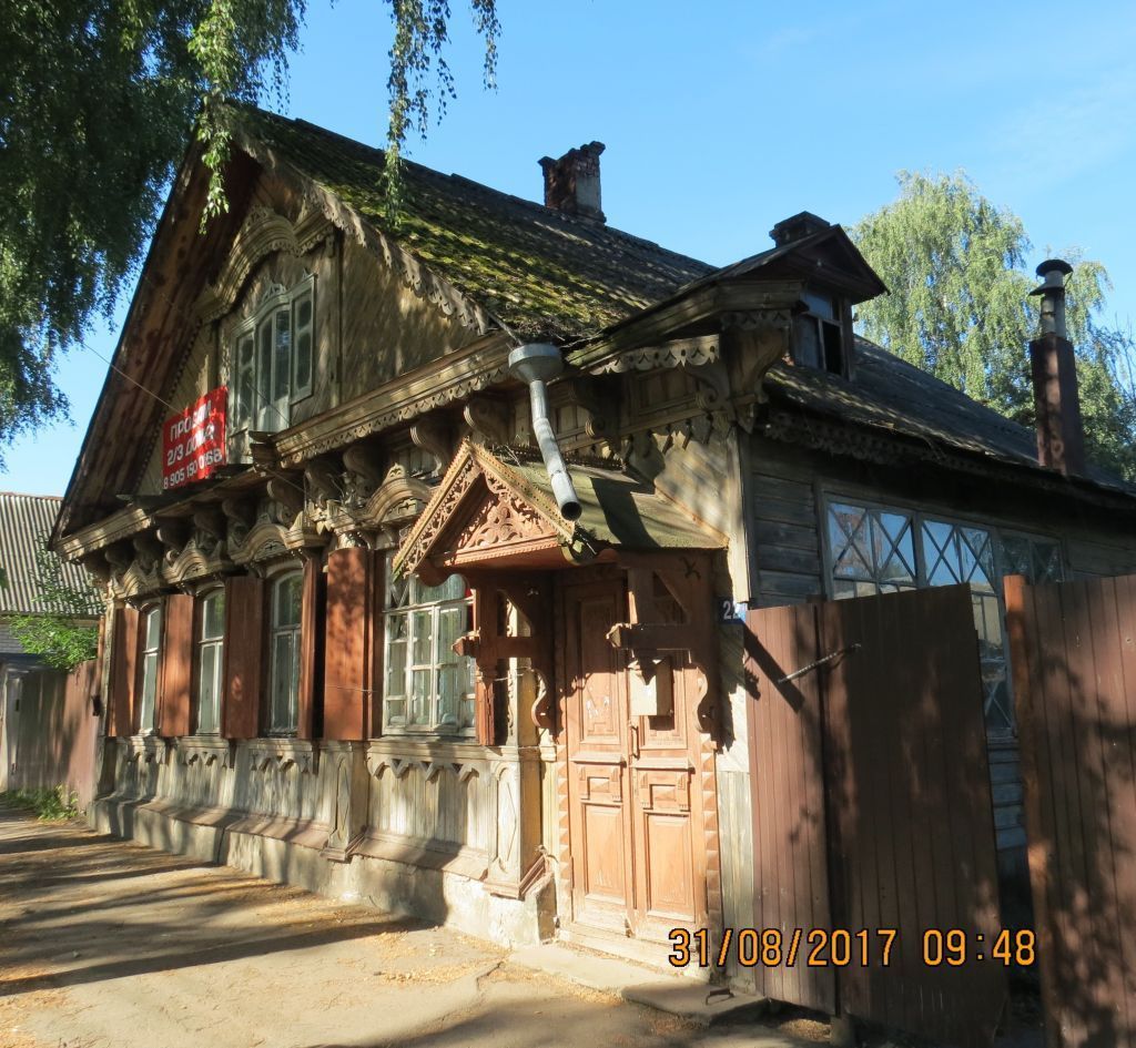 1. Связь с ландшафтом и архитектурно-художественным ансамблем окружающих построек:расположение в застройке улицы Лагерной (бывш. Загородная), на красной линии улицы.2. Стилистические особенности объекта: эклектика.3. Объемно-пространственная и планировочная композиция здания в габаритах стен и перекрытий:1) одноэтажный основной жилой объем почти квадратный в плане, перекрыт высокой двускатной крышей;2) одноэтажный протяженный объем парадных сеней под самостоятельной односкатной крышей, примыкает к боковому (северо-восточному) фасаду основного объема.4. Композиционное решение фасадов:1) главный (юго-восточный) фасад основного объема с ассиметричной композицией разделен перерубом на две неравные части (три оконных проема по левому флангу и один широкий оконный проем по правому флангу от переруба); грань парадных сеней в один дверной проем; дверной проем с оконными проемами по флангам в центре тимпана фронтона (выход из светелки на балкон);2) боковой (северо-восточный) фасад: один оконный проем по левому флангу основного объема; широкий трехчастный оконный проем юго-западной грани сеней (перекрывают ¾ основного объема);3) боковой (юго-западный) фасад: разделен перерубом на две равные части; оконный проем по левому флангу объема.5. Архитектурно-художественное оформление фасадов, включая форму, размер, расстекловку, материал и оформление оконных и дверных проемов:1) основной объем:гладкий, выступающий за плоскость уличных фасадов цоколь с металлическим отливом;лопатки по углам объема и на перерубах: по боковым и дворовому фасаду - гладкие; по главному фасаду и по правому флангу бокового (юго-западного) фасада - выполнены в виде гладких двухчастных пилястр с базами в уровень подоконных карнизов (база и тело колонны дополнены фигурными филенками; объемная накладная резьба филенок (в базе - вертикальный ромб, в теле колонны - резьба растительного орнамента);декоративное оформление оконных проемов с лучковыми перемычками главного фасада и проема бокового (юго-западного) фасада: боковые стойки криволинейного абриса; профилированный подоконный карниз с полотенцем пропильной резьбы (геометрического орнамента по центру и растительного по флангам); профилированный сандрик с лучковым подвышением на парных фигурных кронштейнах, дополненный пропильной и накладной резьбой во фронтоне и карнизах; двустворчатые дощатые ставни проемов по главному фасаду; мелкая расстекловка и цветные стекла трехчастного оконного проема главного фасада (справа от переруба);композиция венчающего карниза на главном (юго-восточном) и боковом (юго-западном) фасадах: профилированный карниз большого выноса с лентой пропильной резьбы по нижней кромке на фигурных валютообразных кронштейнах; широкий фриз, набранный из вертикальных фигурных досочек с резьбой по нижнему краю, ограниченный профилированными полочками; чередующиеся ромбовидные и прямоугольные филенки фриза между кронштейнами;профилированный карниз-полочка в уровне подоконных карнизов проемов - по главному фасаду;пояс из калеванного теса вертикальной укладки в уровень подоконного карниза - по главному фасаду;обшивка калеванным тесом горизонтальной укладки боковых (юго-западного и северо-восточного) фасадов;обшивка калеванным тесом «в елочку» главного фасада;обшивка калеванным тесом «в ело
