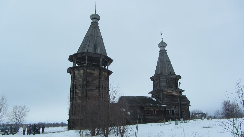 1. Объемно-планировочная структура и архитектурное решение • Исторически сложившееся объемно - планировочное решение церкви, состоящей из алтаря, собственно церкви, увенчанной шатром с главкой, трапезной и сеней, а также поставленной западнее церкви и несколько смещенной к югу шатровой колокольни, соединенной с церковью открытой галереей- крыльцом.• Наличие двух выраженных вертикальных осей, образуемых на западе построенной по типу восьмерик на четверике шатровой колокольней, на востоке — вытянутым вверх, также возведенным по типу восьмерик на четверике срубом собственно церкви с шатровым завершением.• Архитектурное решение фасадов церкви и колокольни, расположение и характер оконных и дверных проемов, галереи - крыльца.• Расположение, характер и рисунок элементов декоративного убранства (в т.ч. причелин, подзоров, резных столбов ограждения галереи-крыльца и звонницы), рисунок ограждения галереи-крыльца и звонницы. Примечание: Здоровые элементы и признаки разновременности сооружения подлежат безусловному сохранению.2. Конструктивные особенности• Способ рубки (из круглых бревен «в обло» с остатком, отесанных изнутри) стен церкви и колокольни, в том числе: - алтаря, трапезной и сеней; - храмового объема, выполненного по типу восьмерик на четверике, с уширениями - повалами в верхней части обоих срубов; - колокольни, состоящей из низкого четверика и поставленного на него высокого восьмигранного сруба с повалами.• Конструктивные схемы перехода четвериков основания звонницы и храмового объема в восьмерики.• Конструктивное решение звонницы, характер ограждения звона (сплошное, из тесин, уложенных в горизонтальном направлении) параметры конструктивных элементов.• Конструктивное решение крыльца-галереи имеющего два крытых лестничных марша, нижние площадки которых покрыты двускатными крышами, поддерживаемыми резными столбами; параметры конструктивных элементов, характер ограждения верхней площадки и лестничных маршей (сплошное, из тесин, уложенных в горизонтальном направлении); угол наклона и размеры в плане лестниц и площадок крыльца.• Конструктивное решение полов (из пластин, уложенных по балкам) и потолков (сенях и трапезной - плоских, балочных, в храмовом помещении- в виде 16-ти частного неба с расположенной над ним плоской страховочной кровлей; в алтаре - пологого двускатного); параметры конструктивных элементов, места расположения балок.• Конструктивное решение, углы наклона и размеры в плане лестницы ведущей на звонницу.• Расположение, конструкция, характер оконных (первоначальные - волоковые; трехкосящатые окна второго строительного периода с сопряжением боковых и верхних косяков «в ус» с заплечиками и имеющие гребень; поздние окна, расширенные в XIX в.) и дверных (трехкосящатые) проемов и их заполнений, в т.ч. конструкция, форма, материал и параметры дверных приборов, характер расстекловки и профилировка импостов оконных рам; характер соединения косяков; характер навески дверных полотен; установленные на окнах кованые решетки.• Конструктивное решение крыш: алтарной бочки; двускатных крыш, перекрывающих объемы трапезной (безгвоздевая по курицам и потокам), сеней (гвоздевая), крыльцо-галерею (с самостоятельными двухскатными крышами над нижними площадками); опирающегося на резные столбы шатра звонницы (с
