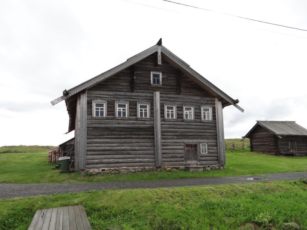 Градостроительные характеристики: местоположение – в общем ряду домов деревенской улицы с ориентацией на нее лицевого, торцевого фасада. Архитектурные и конструктивные характеристики:-общее объемно-планировочное решение дома, сформированного по типу дома-комплекса «брус с уширенным сараем», с расположенными по одной оси жилой и хозяйственной частями. Габариты и очертания по периметру бревенчатых капитальных стен, расположение и габариты внутренних капитальных стен и перерубов;-этажность жилой части – 1 этаж на высоком подклете, хозяйственной – 2 этажа;-архитектурное решение фасадов в отношении расположения и основных габаритов дверных и оконных проемов, крыльца, ворот в хозяйственную часть, взвоза на сарай;-стены – рубленые из круглых бревен «в обло». Высота сруба в отношении количества бревен в продольных и поперечных стенах, включая фронтоны до конька крыши. Связь срубов жилой и хозяйственной частей деревянными замками, место расположения замков на фасадах, форма, габариты;-автономные срубы хлевов, опирание сруба сарая на столбы из бревен - быков, расположение, количество, характер сопряжения бревен стен со столбами; -крыши дома. Форма – двускатная, симметричная, угол наклона скатов. Общий конек над всем домом. Тип крыши – безгвоздевая, с потоками, уложенными по курицам, шеломом по коньку. Количество и места установки куриц, форма шелома и потоков, кровля – дощатая. Слеги – редко врубленные, количество слег и величина выпусков слег по торцам крыши, величина боковых свесов. Места установки и конструкция стропил;-место расположения и тип крыльца – одновсходное, рубленное из бревен, ступени из плах, его конструктивная основа и габариты;-место расположения и конструкция взвоза на сарай;-окна жилой части: конструкция – трехкосящатые, с подоконной доской, с сопряжением косяков под прямым углом, рамы окон – деревянные, рисунок расстекловки;-двери входные в сени – трехкосящатые, форма косяков и тип сопряжения боковых косяков с вершником «на ус», открывание двери внутрь сеней, дверное полотно – плотницкой работы – дощатое на шпонках;-внутренние двери в капитальных стенах – трехкосящатые с сопряжением косяков под прямым углом, их расположение и габариты, исторические филенчатые дверные полотна;-ворота во двор и на сарай со взвоза – двухкосящатые с сопряжением косяков под прямым углом, оформление перекрывающего проем бревна, полотна ворот – плотницкой работы – дощатые на шпонках, навеска – на жиковинах.Декоративные элементы:-резные причелины по торцам крыши и полотенце на лицевом фасаде – рисунок и вид резьбы; на торце крыши хозяйственной части – гладкие дощатые причелины;- на окнах жилой части – наличники рамочные из профилированной доски с навершием из доски с фигурной порезкой, ее рисунок.Интерьер:-стены в жилой части – отёска «по-круглому»;-расположение и конструкция лестницы на второй этаж, угол наклона, вид балясника;-конструкция перекрытий – балочные, с настилом из досок. Количество, расположение, форма сечения балок.Материал (вид материала): материал несущих стен – сосновые бревна, их параметры (средний диаметр), здоровые исторические бревна. Здоровый материал всех исторических конструкций – древесина.Примечание: предмет охраны может быть уточнен по результатам дополнительных натурных и архивных исслед