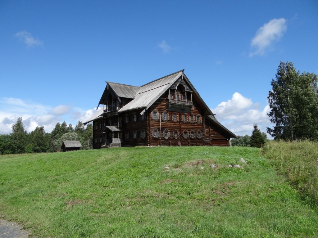 Градостроительные характеристики: местоположение – ориентация главного фасада на запад, на деревенскую улицу. Архитектурные и конструктивные характеристики:-общее объемно-планировочное решение дома, сформированного по типу дома-комплекса «кошель», с расположенными в одной связи жилой частью и хозяйственной, сдвинутой относительно сруба жилья в продольном направлении. Габариты и очертания по периметру бревенчатых капитальных стен, расположение и габариты внутренних капитальных стен и перерубов;-этажность жилой и хозяйственной частей здания – 2 этажа;-архитектурное решение фасадов в отношении расположения и основных габаритов дверных и оконных проемов, ворот, крыльца-галереи, балконов, взвоза на сарай;-надземная часть фундамента: в виде забирки из камней-валунов без раствора по периметру стен, под углами сруба, перерубами – крупные камни-валуны;-стены – рубленые из круглых бревен «в обло», срубы хлевов автономны. Высота срубов в отношении количества бревен в продольных и поперечных стенах, включая фронтоны до конька крыши; -расположение, количество столбов-быков из бревен, поддерживающих сруб второго яруса хоздвора, характер сопряжения бревен стен со столбами; -крыши дома: форма – двускатная, асимметричная, общая над жилой и хозяйственной частями, угол наклона скатов. Общий конек над всем домом. Тип крыши – безгвоздевая, с потоками, уложенными по курицам, шеломом по коньку. Количество и места установки куриц, форма шелома, потоков. Кровля дощатая. Слеги – редко врубленные, количество слег и величина выпусков слег по торцам крыши, величина боковых свесов крыши. Подшивка – платик по слегам на выпусках кровли на фронтонах;-мезонин: место расположения объемное решение, габариты, крыша гвоздевой конструкции, угол наклона ее скатов;-балконы: перед окнами мезонина и окнами светелки на южном фасаде: архитектурное и конструктивное решение, с трехпролетным навершием, опирающимся на столбики, средний пролет – арочный. Балкон на южном фронтоне – с дощатой подшивкой основания в виде падуги. Декоративное оформление балконов;-место расположения и тип крыльца – двухъярусное крыльцо-галерея, его архитектурное решение и конструктивная основа, декоративное оформление, габариты.-место расположения и конструкция взвоза на сарай;-окна жилой части: конструкция – трехкосящатые, с подоконной доской, с сопряжением косяков под прямым углом, рамы окон – деревянные, рисунок расстекловки;-двери входные в сени – трехкосящатые, форма косяков и тип сопряжения боковых косяков с вершником под прямым углом, открывание внутрь сеней, дверное полотно – плотницкой работы – дощатое на шпонках. Историческая покраска дверных полотен;-внутренние исторические двери в капитальных стенах жилой части дома – трехкосящатые с сопряжением косяков под прямым углом, их расположение и габариты, исторические дверные полотна;-ворота во двор и на сарай – двухкосящатые, сопряжение косяков под прямым углом, характер обработки перекрывающего проем бревна с декоративной порезкой, полотна ворот – плотницкой работы – дощатые на шпонках, навеска на жиковинах.Декоративные элементы:-консольные выпуски под кровлю верхних продольных бревен сруба жилой части: габариты, рисунок и вид объемной резьбы;-резные причелины по торцам крыш и полотенца на торцевых фасадах, рис