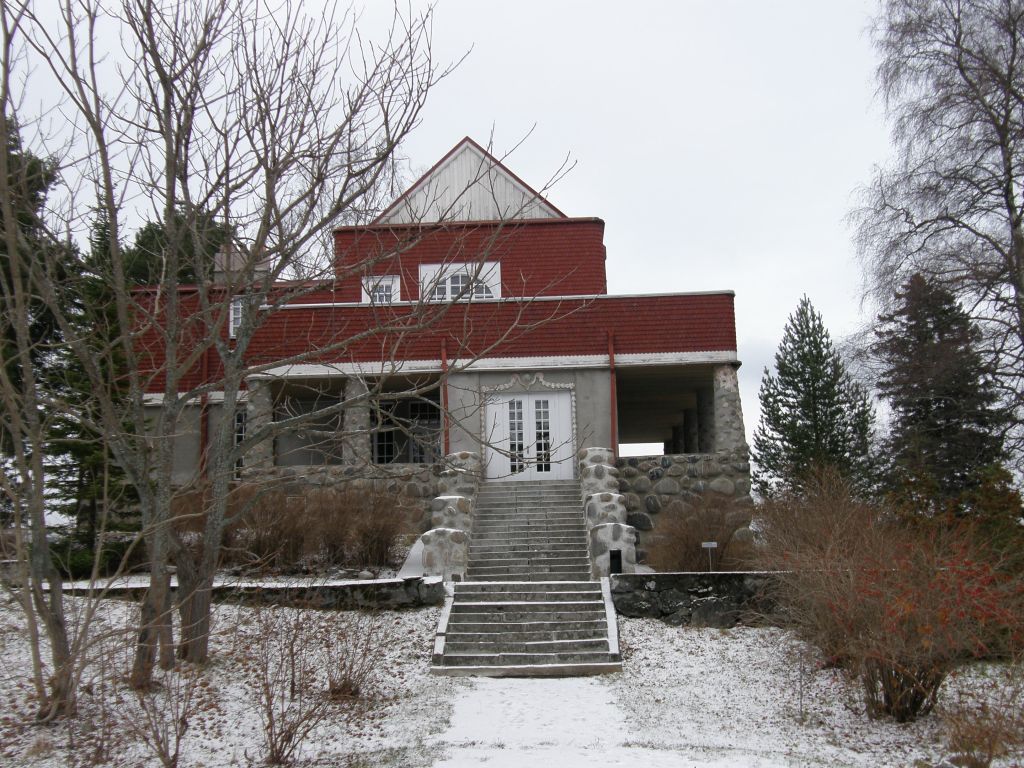 Градостроительная ситуация и территория объекта: Здание гармонично вписано в профессионально созданный дендропарк. Благодаря расположению на высоком скалистом берегу здание является зрительным ориентиром со стороны акватории Ладожского озера.Объемно-планировочная структура и архитектурное решение, в том числе: Компактный двухэтажный разновысокий объем, имеющий форму параллелепипеда под комбинированной крышей - двухскатной над центральной более высокой частью здания и вальмовой над более низким объемом, с дополняющими основной объем эркером, балконами и террасами. Архитектурное решение фасадов, в том числе: Многофасадная асимметричная сложная композиция: с общим для всех фасадов характером отделки – бетонный цоколь с втопленными булыжными камнями, гладкие бетонные стены первого этажа, обшитые темно-красным гонтом стены второго этажа и балконные ограждения.Юго-западный фасад: Асимметричная композиция на высоком цоколе со смещенным к югу объемом аванвестибюля с парадным входом и двухмаршевой гранитной лестницей, обрамленной высоким парапетом из бетона с втопленными в него булыжными камнями. Балкон над аванвестибюлем, опирающийся на массивные круглые бетонные колонны с вкраплением булыжного камня, с открытой террасой под ним.Два высоких окна и дверь выхода на террасу в уровне первого этажа.Прямоугольный разновысокий объем второго этажа, с более высокой правой частью под двускатной крышей с фронтоном, обшитым тесом в вертикальном направлении, с дверью выхода на балкон и полукруглым окном в прямоугольном обрамлении, обшитом тесом.Пониженный левый объем второго этажа под вальмовой крышей с одним невысоким сдвоенным окном в центре.Юго-восточный фасад: Симметричная композиция на высоком цоколе с балконом вдоль всего фасада на массивных круглых столбах с вкраплением булыжного камня и открытой террасой под ним. Два проема – оконный и дверной в уровне первого этажа, расположенная в центре фасада, дверь выхода на террасу из аванвестибюля и два оконных проема в центральной части объема второго этажа.Северо-восточный фасад: Асимметричная композиция на высоком цоколе, с ведущей на террасу одномаршевой гранитной лестницей с бетонными парапетами, отделанными булыжным камнем.Расположенные в уровне первого этажа высокое окно в правой части фасада и остекленный с трех сторон эркер в левой части, с устроенным над ним в уровне второго этажа балконом, опирающимся на две массивные круглые колонны с вкраплением булыжного камня.Прямоугольный разновысокий объем второго этажа, с глухой правой частью под вальмовой крышей и с более высокой левой частью под двускатной крышей с фронтоном, обшитым тесом в вертикальном направлении, с дверью выхода на балкон и полукруглым окном в прямоугольном обрамлении, обшитом тесом.Северо-западный фасад: Асимметричная композиция с входным тамбуром в центре, высоким сдвоенным окном справа от тамбура в уровне первого этажа и симметрично расположенными двумя сдвоенными высокими окнами в уровне второго этажа. Колористическое решение фасадов – красно-коричневый цвет гонта, естественный цвет булыжного камня, белый цвет оконных и дверных заполнений и декоративного пояска, проходящего по нижнему краю гонтовой обшивки фасадов. Декоративное оформление фасадов: Отделка колонн и ограждения т