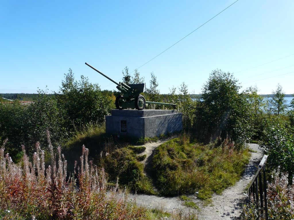 Памятный знак на месте, где проходил передний край обороны Ребольского направления Карельского фронта (пушка)