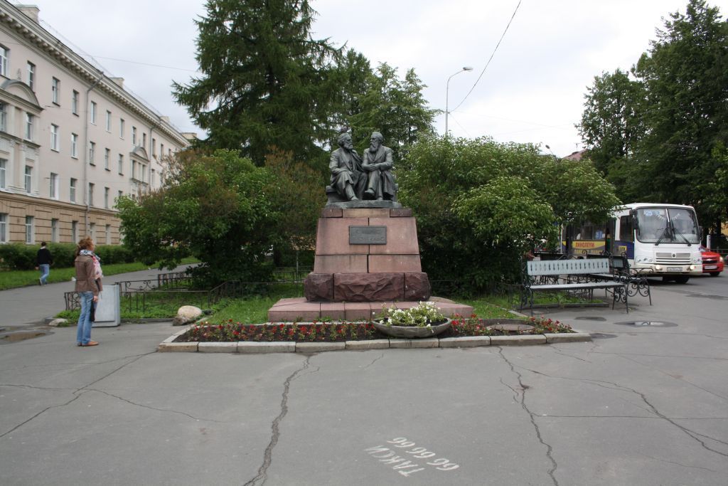 Градостроительная ситуация и территория:- расположение в начале ул. Куйбышева с ориентацией фронтона на юго-восток.Объемно-пространственное и архитектурное решение:- К. Маркс и Ф. Энгельс изображены во время беседы, сидящими на скамейке, фигуры слегка повернуты друг к другу; К. Маркс изображен сидящим в более свободной позе: правая рука лежит на колене, в опущенной кисти – газета; Ф. Энгельс сидит положив ногу на ногу, кисти рук сцеплены на колене. Раскрыт углубленный характер общения. Лица портретные, в духе широко известных трактовок образов. Пряди волос прически, усов, бород изображены подробно, но без живописности. Одежда: длинные сюртуки, брюки, обувь с квадратными носами; складки одежды изображены подробно, но не измельчены;- постамент в виде усеченной пирамиды из гладкотесаных блоков, которая в свою очередь установлена на прямоугольной подушке; все сооружение установлено на низком стилобате. В центре лицевой части постамента расположена надпись в две строки: «К. Маркс ‒ Ф. Энгельс».Конструктивные особенности и габариты:- материал элементов памятника: скульптурная часть выполнена из бронзы; постамент – из малинового кварцита;- габариты элементов памятника: скульптурная группа ‒ 1,7х1,5х1,3 м, постамент ‒ 1,8х2,2х1,9 (1,4) м; стилобат – 0,2х3,6х3,2 м;- надпись: шрифт брусковый, полужирный, широкий, скругления малого радиуса.*Предмет охраны может быть дополнен в процессе комплексных научных исследований и осуществления производства работ по сохранению объекта культурного наследия.