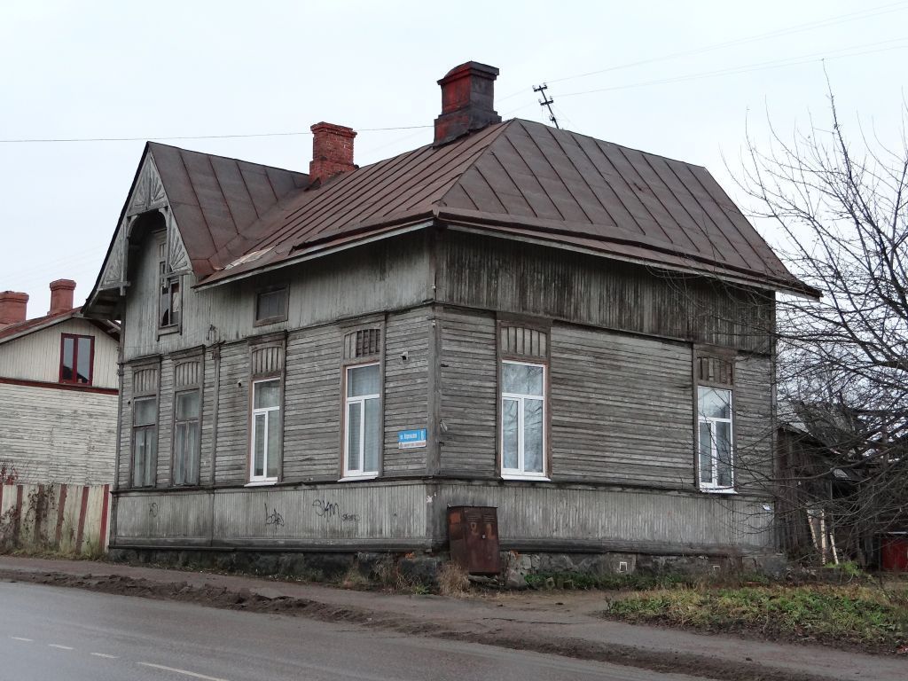 Градостроительная ситуация и территория объекта: Рядовое положение в планировочной структуре ул. Карельской с главным фасадом, выходящим на ее красную линию. Объемно-планировочная структура и архитектурное решение: Исторически сложившаяся объемно-планировочная структура: два одноэтажных параллелепипеда основного объема на невысоком цоколе, поставленных по углам 90 друг к другу, под вальмовой крышей, с мансардой, крытой на два ската, с примыкающим к основному объему со стороны двора объемом прямоугольных в плане сеней. Конфигурация и габаритные размеры здания в плане. Высокие отметки основного объема, верхнего обреза стен основного объема, всех уклонов крыш, в том числе треугольных фронтонов мансарды, карниза, цоколя, оконных, в том числе чердачных, дверных проемов. Расположение, конфигурация и параметры исторических оконных, в том числе чердачных, и дверных проемов и простенков между ними. Архитектурное решение фасадов, в том числе главного – асимметричного с возвышающимся треугольным фронтоном мансарды на его левом фланге. Дисимметричная композиция правого бокового фасада: с ассиметричной крышей;с расположенными вытянутыми по вертикали окнами по обе стороны оси на равных расстояниях. Левый боковой фасад глухой. Асимметричная композиция дворового фасада с возвышающимся треугольным фронтоном мансарды на левом, выступающем фланге. Характер отделки стен фасадов: обшивка профилированным тёсом от верха цоколя до низа окон и в пределах мансарды в вертикальном направлении, от низа окон до мансарды – в горизонтальном с выделением углов здания дощатыми пилятрами. Декоративное оформление фасадов здания (местоположение и профиль сечения элементов): - горизонтальные профилированные тяги, проходящие в уровнях верха и низа окон первого этажа, в уровне верха цоколя; - боковины наличников окон с треугольными выемками на ребрах и глухой резьбой в виде кружков; - верхняя часть наличника, состоящая из вертикально поставленных на равном расстоянии друг от друга узких, длинных реек, на окнах первого этажа сверху обрамленных дугообразной, а на окнах мансарды – прямой доской с треугольными накладками по краям;- выступающей архитрав, фриз с горизонтальной глухой бороздой и карниз объединяющие боковины и верхнюю часть наличника; - верхняя часть композиции фронтона мансарды, образованная двумя декоративными брусьями: горизонтальным и вертикальным, по оси фронтона. Брусья с треугольными выемками вдоль ребер. Треугольное пространство между брусьям и причелинами, забранное щитами с накладной резьбой, представляющей ¼ часть «солнца»; - нижние части композиции фронтона мансарды в виде пересекающихся вертикального и горизонтального декоративных брусьев с выпуском концом. Заполнение между брусьями и причелинами аналогичное заполнению верхней части. Соединение верхней и нижних частей композиции между щитами дугообразными кронштейнами. Конструктивные особенности: Материал, расположение, конструкция бутового, ленточного фундамента, несущих наружных и внутренних стен (деревянных, рубленных их бруса «в лапу», обшитых профилированным тёсом в двух направлениях), деревянного по балкам цокольного и чердачного перекрытий. Конструкция и конфигурация деревянной стропильной вальмовой с изломом в нижней части крыши основного объема и од