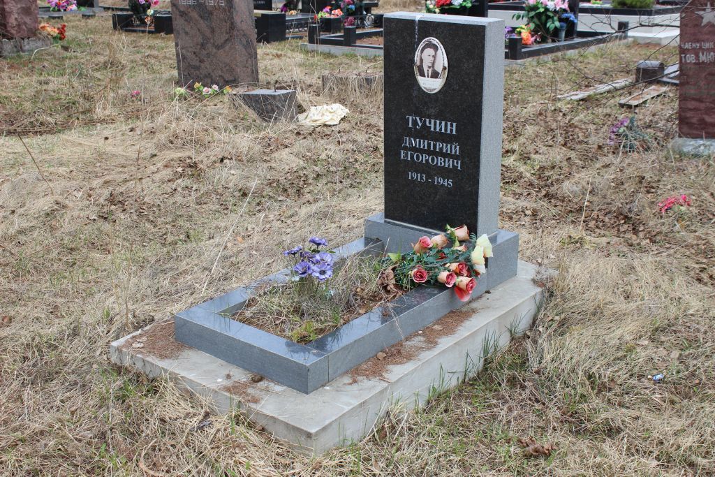 1.Местоположение могилы: на участке почётных захоронений Сулажгорского кладбища, в 30 м от главного входа, в 38 м слева от центральной аллеи.2.Объемно-пространственные характеристики объекта:захоронение в полном объеме (от поверхности земли) на месте бетонной плиты с цветником размером: 1,35 х 0,76 м.Точные границы могилы могут быть определены путем натурных исследований.3.Мемориальная составляющая объекта:В могиле захоронен Тучин Дмитрий Егорович (1913-25.06.1945).