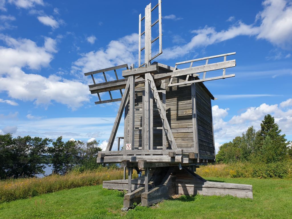 Градостроительные характеристики: местоположение – на открытом, возвышенном месте. Архитектурные и конструктивные характеристики:общее объемно-планировочное решение мельницы-столбовки. Габариты и очертания по периметру стен с учетом выпусков опорных бревен поворотной платформы и рубленой из бруса опорной крестовины;этажность здания – 1 ярус; архитектурное решение фасадов в отношении расположения и основных габаритов исторического дверного проема, окна, крыльчатки, поворотной платформы;стены – каркасные, материал и конструкция каркаса из бруса, обшивка из горизонтально уложенных широких досок, толщина, профиль досок, оформление углов вертикально установленными досками по типу лопаток, высота боковых стен от верха платформы до карниза, торцевых – до конька крыши; крыша – двухскатная гвоздевая, с коневой слегой и стропилами, кровля по сплошному дощатому настилу – дранка, по коньку – горизонтально уложенные доски, величина выпусков кровли по торцам крыши и величина боковых свесов;дверной проем – с коробкой из брусьев, дверное полотно дощатое, плотницкой работы;конструкция опорной крестовины мельницы в виде парных стенок из двухкантного бруса – высота крестовины, очертания верха стенок, характер затески торцов бруса; вырезанная надпись на одном из брусьев даты и мастера постройки; параметры осевого столба и поворотного рычага;крыльцо с лестницей – конструкция, габариты;крыльчатка мельницы – четырехкрылка, место и характер крепления крыльев, конструкция, габариты.Интерьер:мельничное оборудование: расположение, конструкция, система опорных элементов и крепления между собой жерновов, передаточных шестерён, короба и лотков для зерна, поворотного вала;помост для жерновов – место расположения, габариты, конструкция лестницы со ступенями.Материал (вид материала): материал стен – сосновые брус и доски, их параметры, здоровые исторические элементы, следы первоначальной покраски досок обшивки – желтая охра; здоровый материал всех основных исторических конструкций – древесина, металлические крепежные элементы.Примечание: предмет охраны может быть уточнен по результатам дополнительных натурных и архивных исследований.
