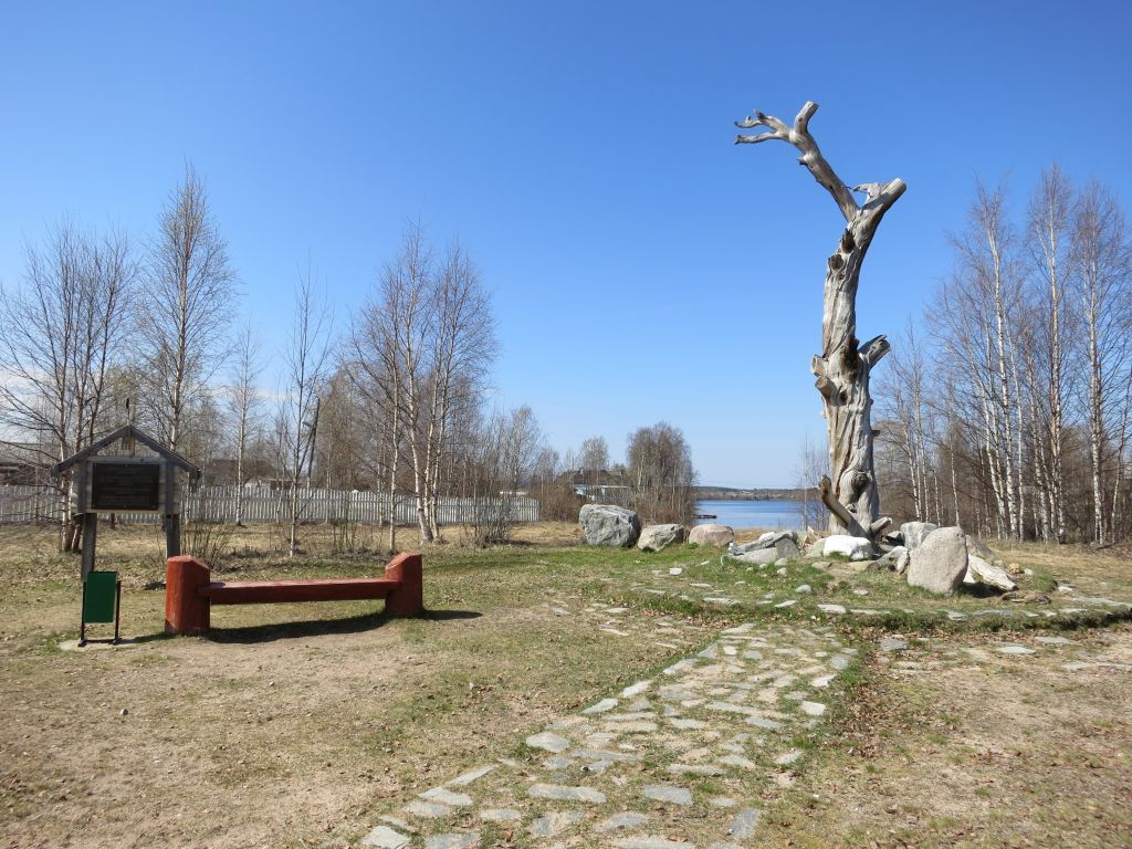 Памятный знак-ствол вековой сосны, под которой в 1830-х гг. в селе Ухта производил записи рун знаменитый финский учёный собиратель рун и составитель эпоса "Калевала"-Элиас Леннрот (1802-1884)
