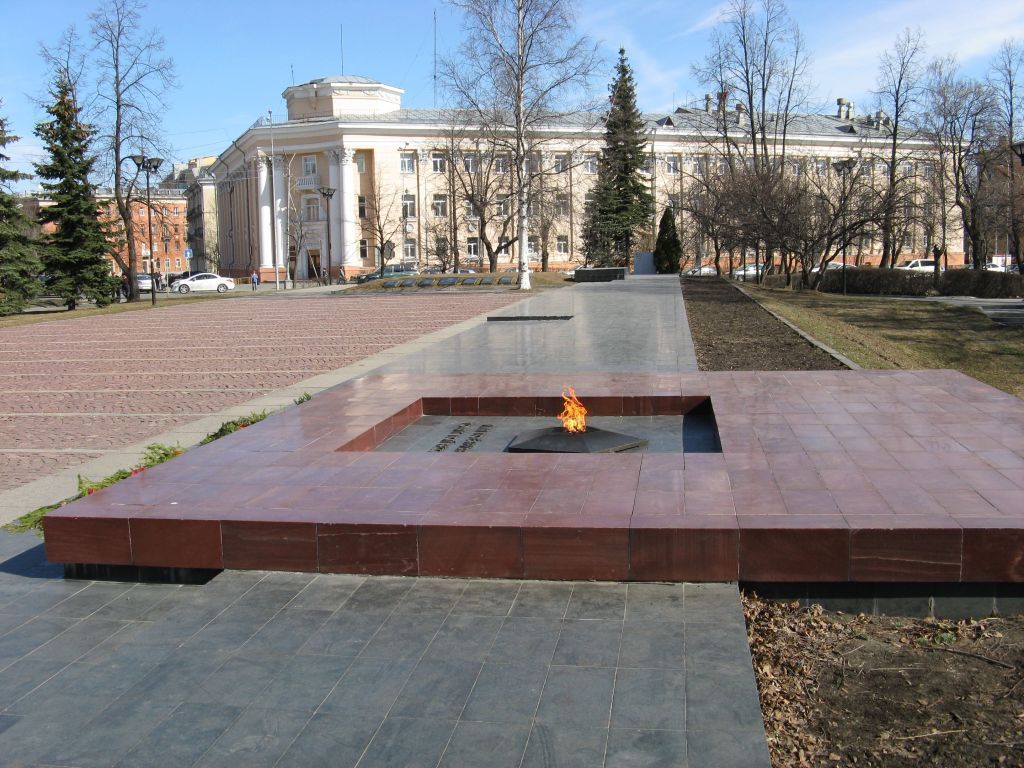 Мемориал: братская могила и могила Неизвестного солдата с Вечным огнем. На памятном знаке - 60-тонной глыбе серой скалы - высечен текст "Героям, сынам Октября, кто жизнь свою отдал за счастье народа, памятник этот воздвигнут". У Вечного огня на полированн