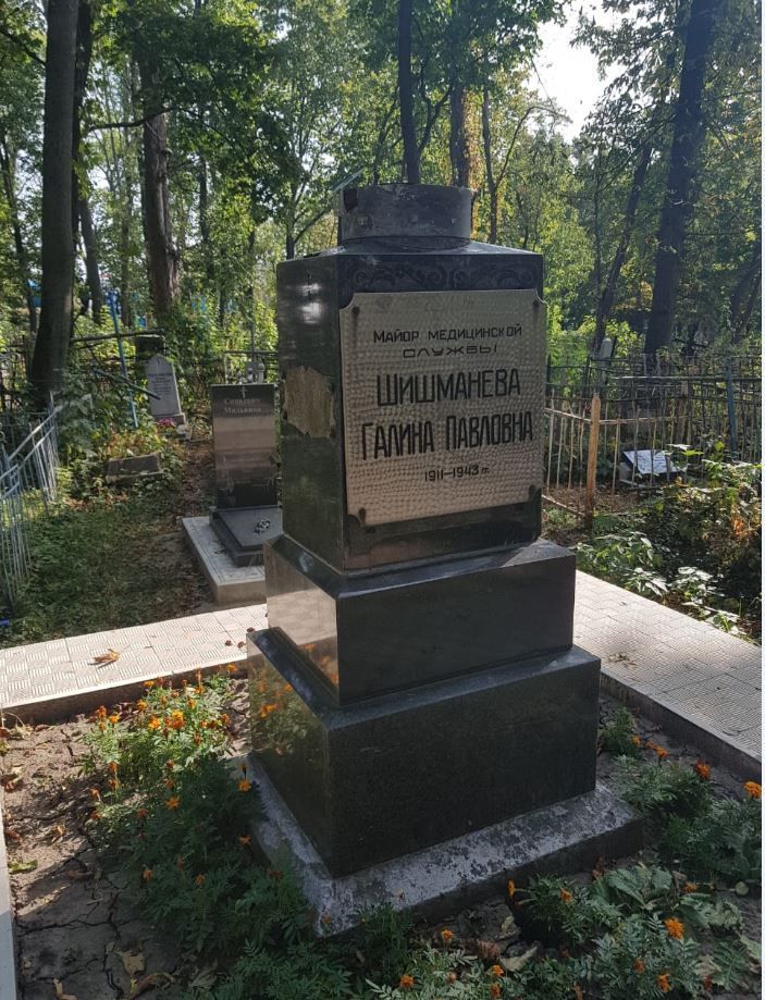 Мемориальное значение объекта:причастность к событиям Великой Отечественной войны 1941-1945 гг.; историко-культурная ценность могилы майора медицинской службы - врача управления Центрального фронта Шишманевой Г.П.; история объекта, связанная с майором медицинской службы врачом управления Центрального фронта Шишманевой Г.П., погибшей во время Великой Отечественной войны в 1943 г.Местоположение захоронения:существующее местоположение захоронения по адресу: Курская область, г. Курск, улица Карла Маркса (Никитское кладбище), в окружении иных захоронений.Захоронение (могила) Шишманевой Галины Павловны 1911-1943 гг. в полном объеме от поверхности земли.