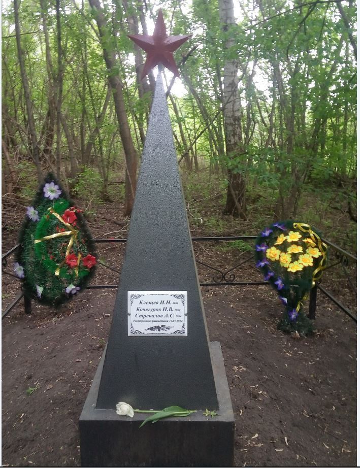 Градостроительные характеристики объекта: местоположение в структуре Солнцевского района Курской области, на окраине х. Сорочино, по правой стороне дороги по ул. Сорочинская, на северо-восток в сторону с. Плоское. Мемориальное значение объекта: причастность к событиям Великой Отечественной войны 1941-1945 гг.; место памяти трех жителей х. Сорочино - Клещева И.Н., 1886 г.р., Кочегурова Н.В., 1904 г.р., Стрекалова А.С., 1904 г.р., расстрелянных фашистами 14.01.1942 г. Объемно-пространственные характеристики объекта: искусственная насыпь над братской могилой мирных жителей в виде надгробного холма, обнесенного оградой; надгробный знак из металла, в виде четырехгранного обелиска с красной звездой в навершии, высотой 1,8 м, с памятной табличкой; территория могилы в границах надгробного холма, обнесенного оградой. Конструктивные характеристики объекта: материал: металл (уточняется по результатам реставрационных и лабораторных исследований); габариты, конфигурация, материал, оформление памятника, включая могилу. Пространственно-планировочные характеристики объекта: расположение объекта на территории прямоугольного участка с надгробным холмом и знаком, огороженного металлической невысокой оградой, окруженного растительностью, ориентированного на дорогу.