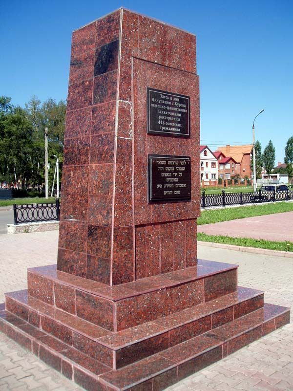 Градостроительные характеристики объекта:местоположение в структуре ул. Карла Маркса (на 512 километре шоссе Москва-Курск) города Курска Курской области, на территории мемориального комплекса «Курская дуга», со стороны южного фасада храма Великомученика Георгия Победоносца.Мемориальное значение объекта:причастность к событиям Великой Отечественной войны 1941-1945 гг.Объемно-пространственные характеристики объекта:обелиск «Место расстрела советских граждан немецко-фашистским и захватчиками в 1941-1943 годах. Обелиск установлен в 1968 году» в виде усеченной пирамиды высотой 2,9 м, размером оснований 1,25 х 1,25 м, вверху 1,15 х 1,15 м; двухступенчатая база в основании высотой 0,65 м; размер первой ступени 1,7 х 1,7 м, высотой 0,2 м; размер второй ступени 1,45 х 1,45 м, высотой 0,45 м; квадратное основание высотой 0,2 м; две черные гранитные полированные плиты на лицевой плоскости, выступающей за боковую грань на 5 см, с высеченной на них памятной надписью на русском языке: «Здесь в дни оккупации г. Курска немецко-фашистскими захватчиками расстреляны 443 советских гражданина», на иврите: «Памяти жертв катастрофы, которые были убиты на этом месте немецкими нацистами и их единственная вина, что они евреи.».Конструктивные характеристики объекта:материал: гранит, бетон (уточняется по результатам реставрационных и лабораторных исследований); габариты, конфигурация, материал, оформление памятника.Пространственно-планировочные характеристики объекта:расположение объекта на территории неогороженного прямоугольного участка с постаментом, на территории мемориального комплекса «Курская дуга», южнее храма Великомученика Георгия Победоносца.