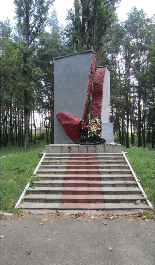 Градостроительные характеристики объекта: местоположение в структуре Курского района Курской области, в центре д. Щетинка Щетинского сельсовета, вдоль автодороги Курск-Поныри, на небольшом холме-насыпи. Мемориальное значение объекта: причастность к событиям Великой Отечественной войны 1941-1945 гг.Объемно-пространственные характеристики объекта: памятный знак в виде надмогильного сооружения из железобетона, высотой 3,5 м, выполненного из двух частей, установленных перпендикулярно друг к другу, и символизирующего разрушенную стену; постамент в основании, облицованный тротуарной плиткой серого цвета, высотой 0,27 м и размерами 2,75 х 2,78 м; гранитная плита в правой передней части, под наклоном, с памятной надписью: «На этом месте захоронены жители г. Курска и Курской области, расстрелянные в период оккупации фашистскими варварами», изображением Вечного огня в нижней части и именами погибших мирных жителей, размером 0,5 х 1,0 м; лестница из десяти ступеней, ведущая к постаменту с памятным знаком.Конструктивные характеристики объекта: материал: железобетон, гранит (уточняется по результатам реставрационных и лабораторных исследований); габариты, конфигурация, материал, оформление памятника. Пространственно-планировочные характеристики объекта: расположение объекта на территории неогороженного прямоугольного лесистого участка, с постаментом и скульптурой на центральной оси участка, на небольшом холме-насыпи, с лестницей, ведущей к памятному знаку, и мемориальной плитой с правой стороны участка.