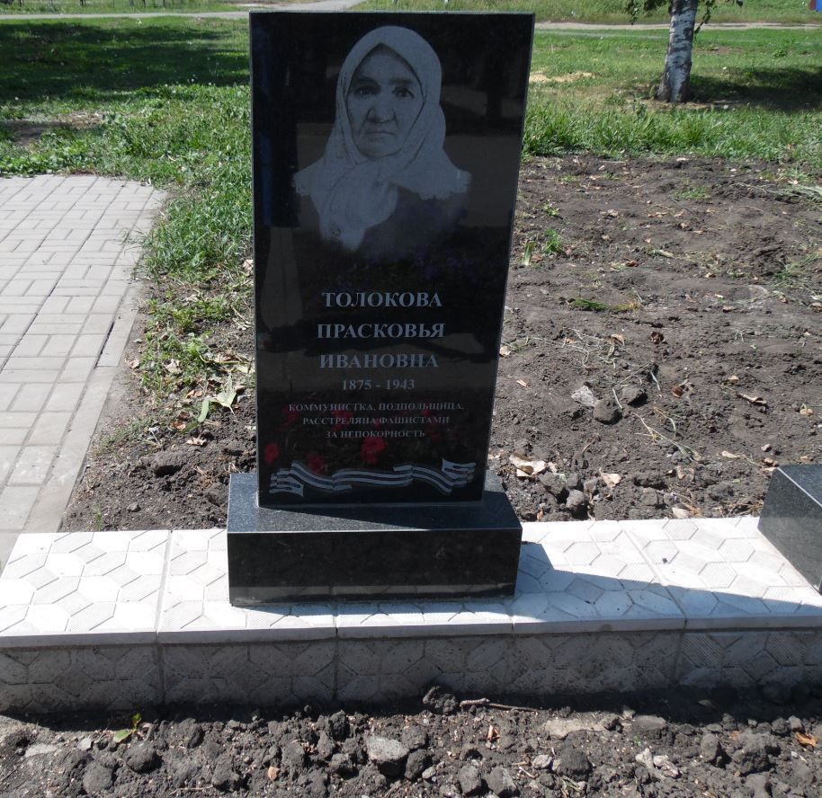 Градостроительные характеристики объекта:местоположение в структуре села Мантурово Курской области.Мемориальное значение объекта:причастность к событиям Великой Отечественной войны 1941-1945 гг.; история памятника, связанная с жизнью коммунистки Толоковой П.И.Пространственно-планировочные характеристики объекта:исторический участок месторасположения памятника; памятник не огражден, располагается в парке с брусчатым покрытием.