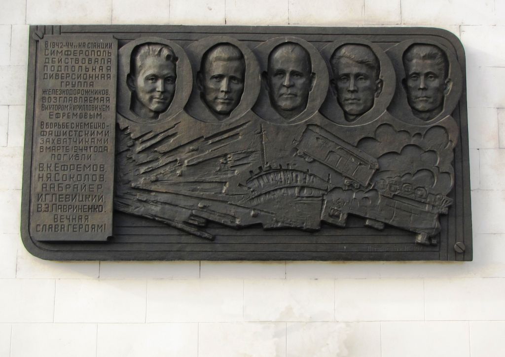 Предмет охраны объекта культурного наследия регионального значения «Мемориальный знак в честь подпольной диверсионной группы железнодорожников В.К. Ефремова», 1943-1944 годы, 1972 год, расположенного по адресу: Республика Крым, г. Симферополь, пл. Привокзальная, на здании железнодорожного вокзала станции «Симферополь».Авторство: В.В. Петренко, Н.И. Петренко.Историко-художественная ценность: Авторское решение (скульпторы В.В. и Н.И. Петренко).Мемориальная доскаМемориальная доска из литой бронзы, размером 2,23х1,2(h) м, прикреплена к стене здания железнодорожного вокзала станции «Симферополь». На доске изображено пять портретов участников подпольной диверсионной группы железнодорожников в виде барельефа, размером 1,7х0,95(h) м. Слева от барельефа выполнена мемориальная надпись (0,4х1,03(h) м): «В 1942-44 гг. на станции Симферополь действовала подпольная диверсионная группа железнодорожников, возглавляемая Виктором Кирилловичем Ефремовым. В борьбе с немецко-фашистскими захватчиками в марте 1944 года погибли: В.К. ЕФРЕМОВ, Н.Я. СОКОЛОВ, А.А. БРАЙЕР, И.Г. ЛЕВИЦКИЙ, В.Е. ЛАВРИНЕНКО. Вечная слава героям!»Охраняется.- местоположение, конфигурация, габариты доски, сюжет (тематика) барельефа, тип материала;- содержание мемориальной надписи (с возможностью уточнения по данным архивов).Предмет охраны может уточняться после проведения комплексных научных исследований.
