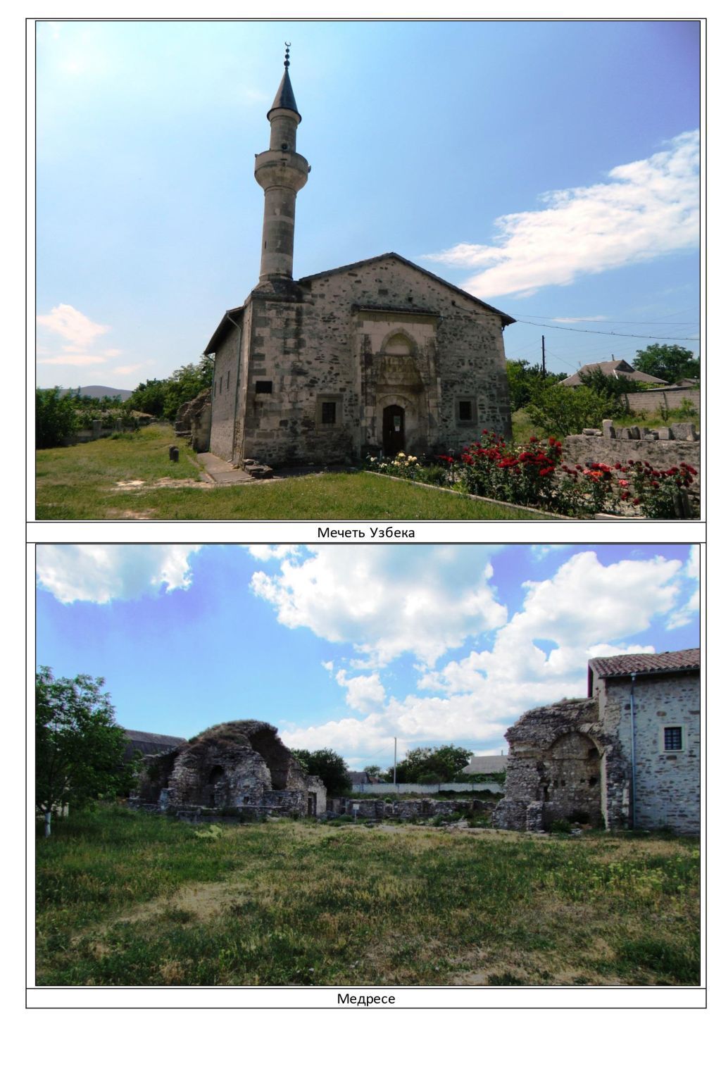Предмет охраны объекта культурного наследия федерального значения «Мечеть и медресе», 1314 года.Объемно-пространственное и планировочное решение территории: - охраняются местоположение и градостроительные характеристики исторической застройки участка, формирующего небольшую площадь, на пересечении улиц Луговой, Халтурина и Красноармейской; взаимное расположение частей памятника, соотношение открытых участков площади и входной зоны мечети-медресе; видовые раскрытия зданий и руин с улиц Красноармейской, Луговой и Халтурина; территория в установленных границах.Историческая территория объекта культурного наследия – части средневековой городской застройки:- охраняются слои антропогенного происхождения в границах территории объекта культурного наследия, включающие археологические движимые и недвижимые объекты.МечетьОбъемно-пространственное решение: - охраняются видовые раскрытия здания мечети с улиц Красноармейской, Луговой и Халтурина; габариты прямоугольного в плане одноэтажного здания с чердаком и пристроенным минаретом; кровля, ее конфигурация и габариты; местоположение входов в мечеть и минарет.Конструктивная система:исторические наружные капитальные стены мечети и минарета: - охраняются конфигурация, габариты, материал (блоки тесаного известняка, бутовый камень-известняк, плинфа, дерево); техника кладки (лицевая кладка углов здания мечети и минарета из блоков тесаного камня, бутовая кладка стен из известняка с добавлением плинфы и деревянными балками-поясами, на известковом растворе).- охраняются местоположение и конфигурация внутренней лестницы минарета.- охраняются тип материала чердачного перекрытия и конструкций кровли (дерево).- охраняются конфигурация кровли (двускатная), материал окрытия (керамическая желобчатая неглазурованная черепица - «татарка»). Объемно-планировочное решение:- охраняются историческая планировочная структура здания в пределах капитальных стен: вытянутый прямоугольный, ориентированный на юг объем зала с одним входом в северной и молитвенной нишей-михрабом в противоположной (южной) стене, разделенного на три нефа двумя продольными аркадами на резных каменных столбах, с изолированным внутренним пространством минарета с внутренней винтовой лестницей, с плоским потолком и чердаком, перекрытый двускатной кровлей.Архитектурно-художественное решение фасадов:фасады здания мечети выполнены в стиле крымско-татарской исламской архитектуры базиликального типа;- охраняется исторический материал оформления фасадов (лицевая кладка из камня, резьба по камню).Композиционная структура Главного (северного) фасада: одноэтажный, без цоколя, акцентированный в плоскости стен прямоугольным в плане (в первом ярусе), в форме усеченной пирамиды (в переходе ко второму, цилиндрическому, ярусу) основанием минарета на северо-восточном углу, с выступающим из плоскости стены порталом входа в мечеть – по центральной оси;- охраняются габариты, материал (известняк, плинфа), техника кладки (лицевая кладка блоками тесаного известняка на углах фасада и стенах основания минарета, на портале, бутовая кладка плоскости стены на известковом растворе);Каменная отмостка из плит:- охраняется тип материала (камень-известняк).Прямоугольные окна (2 шт), фланкирующих портал входа в мечеть, с резными профилиро