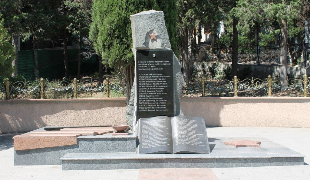 Предмет охраны объекта культурного наследия регионального значения «Памятник жителям поселка Симеиз, погибшим в боях за Родину», 1941-1944 годы, 1960-е годы, расположенного по адресу: Республика Крым, городской округ Ялта, пгт Симеиз, ул. Советская.Историко-художественная ценностьАвторское решение памятника (автор неизвестен).Мемориальное сооружениеМемориал включает в себя: вертикальную стелу, подушку в виде раскрытой книги и подиум.Охраняется: местоположение, композиционное решение памятника с акцентом на вертикальной стеле.Вертикальная стелаСтела в виде диабазовой глыбы (габаритные размеры: 1,2 х 0,9 х 3,0(h) м) установлена на подиуме. В верхней части лицевой грани стелы расположено рельефное изображение пятиконечной звезды из красного гранита, ниже вмонтирована мемориальная доска из габбро прямоугольной формы с надписью: «В память жителям посёлка Симеиз, погибшим в Великую Отечественную войну 1941 – 1945 гг. Благодарные односельчане», далее – список ФИО павших односельчан (см. Карточку объекта).Охраняется:- стела: местоположение, конфигурация, габариты, форма, характер исполнения, тип материала (диабаз);- рельефная звезда: местоположение, форма, габариты, тип материала (красный гранит);- мемориальная доска: местоположение (с лицевой стороны стелы), габариты, форма, тип материала (габбро);- содержание мемориальной надписи;- список ФИО павших односельчан (см. Карточку объекта) – с возможностью уточнения информации по данным архивов.Подушка в виде раскрытой книгиПеред стелой, на бетонном постаменте, облицованном натуральным камнем, установлена подушка из габбро (габаритные размеры: 1,3 х 1,1 м) в виде раскрытой книги.На лицевой наклонной грани подушки расположены списки ФИО павших односельчан (см. Карточку объекта).Охраняется:- подушка: местоположение, конфигурация, габариты, форма, тематика (сюжет), тип материала (габбро);- постамент: местоположение, конфигурация, габариты, форма; тип материала, колористическое решение и тип облицовки – после проведения комплексных научных исследований;- список ФИО павших односельчан на лицевой грани подушки (см. Карточку объекта) – с возможностью уточнения информации по данным архивов.ПодиумСтела и подушка расположены на двухступенчатом подиуме из серого гранита (габаритные размеры нижней ступени - 4,2 х 2,6 х 0,2(h) м; верхней - 2,6 х 2,1 х 0,5(h) м).В правой части нижней ступени расположено рельефное изображение пятиконечной звезды из красного гранита, диаметром 0,8 м.В центральной части верхней ступени подиума расположено стилизованное рельефное изображение лежащего знамени и флагштока, выполненное из гранита красного (знамя) и серого (флагшток) цветов; правее установлен вазон из красного гранита, диаметром 0,35 м.Охраняется:- подиум: местоположение, конфигурация, габариты, форма, тип материала (серый гранит); высотные отметки ступеней;- рельефы, вазон: местоположение, форма, габариты, тематика (сюжет) тип материала (красный и серый гранит).БлагоустройствоПамятник установлен на площадке с покрытием из серых и красных гранитных плит. На прилегающей территории установлены вазоны и устроены цветники. С северной стороны площадка ограждена подпорной стенкой, окрашенной в бежевый цвет, на которой установлено металлическое ограждение золотистого и черного цвета в виде столбов с декоративным заполнением между ними.Охр